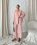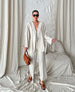 The set consists of a loose-fitting tunic with a deep V-neck and decorative ties, as well as wide-cut trousers with a flowing silhouette. The lightweight linen blend ensures an airy feel and lets you walk through the day in style.