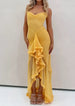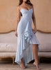 Add a touch of glamour to your look with our stylish black evening dress. This figure-hugging style features a sophisticated design with an asymmetric hem and intricate ruffles that lend the dress a dramatic, feminine touch. The delicate draping at the waist perfectly accentuates your silhouette, while the plunging sweetheart neckline with delicate lace embellishment creates an elegant décolleté.