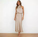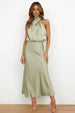 Add timeless elegance to your look with our elegant satin dress in a flattering champagne shade. The dress features a sophisticated waterfall collar and figure-hugging silhouette, creating a feminine yet stylish look.