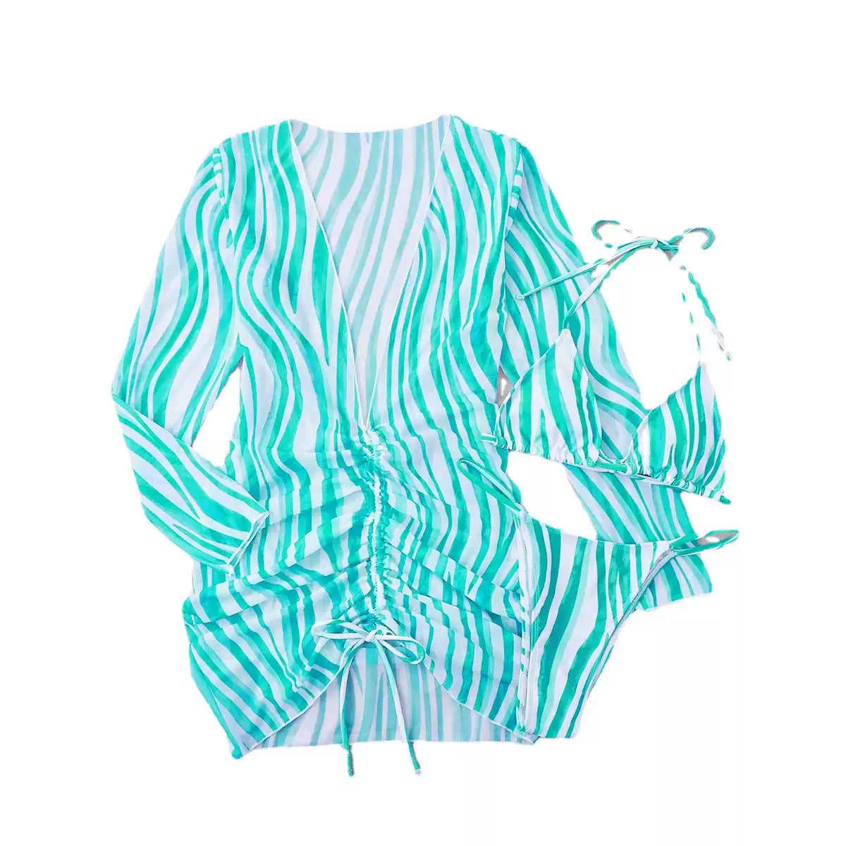 Das dreiteilige Set besteht aus einem stylischen Bikini-Oberteil, einer passenden Bikini-Hose und einer modischen, langärmeligen Bluse mit coolem Streifenmuster. Die Bluse ist nicht nur ein idealer Sonnenschutz, sondern auch ein echter Hingucker mit ihren einzigartigen Designelementen und dem praktischen Kordelzug, der eine individuelle Anpassung und eine schmeichelhafte Silhouette ermöglicht.