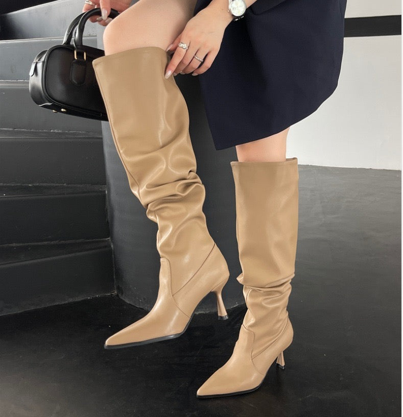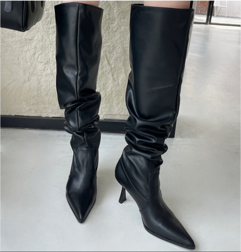Setze ein Statement mit diesen eleganten Overknees-Stiefeln aus hochwertigem Kunstleder. Das edle schwarze Design mit faltenförmiger Schaftstruktur und spitzer Zehenform verleiht deinem Look eine moderne, selbstbewusste Ausstrahlung. Der feine Absatz sorgt für eine feminine Silhouette und streckt optisch das Bein – perfekt für den urbanen Chic oder den eleganten Abendauftritt.