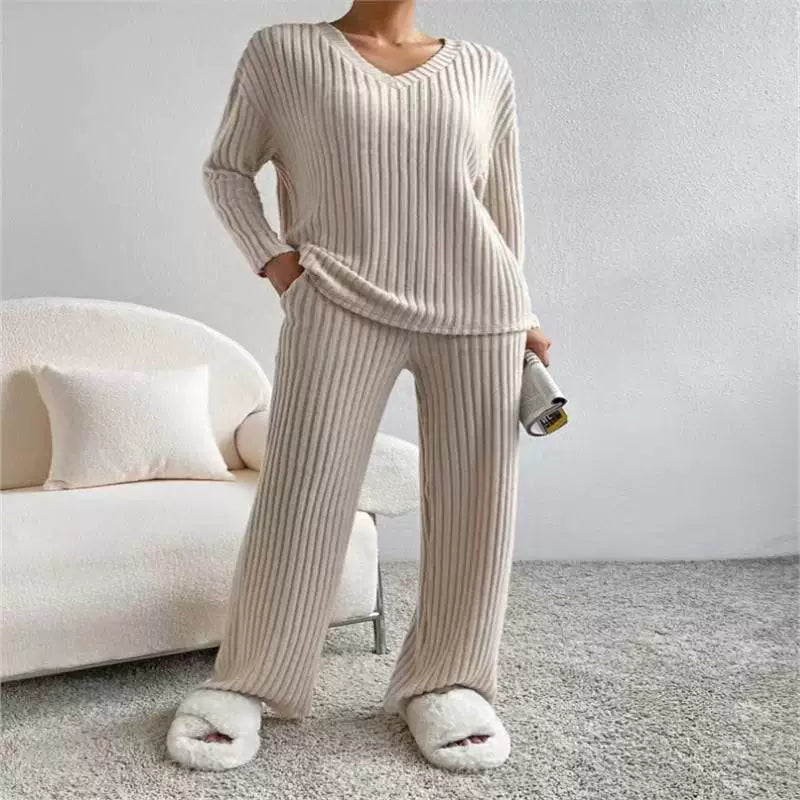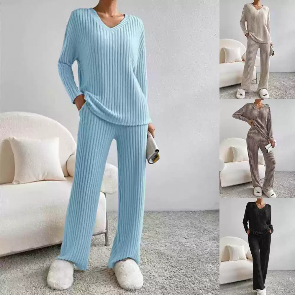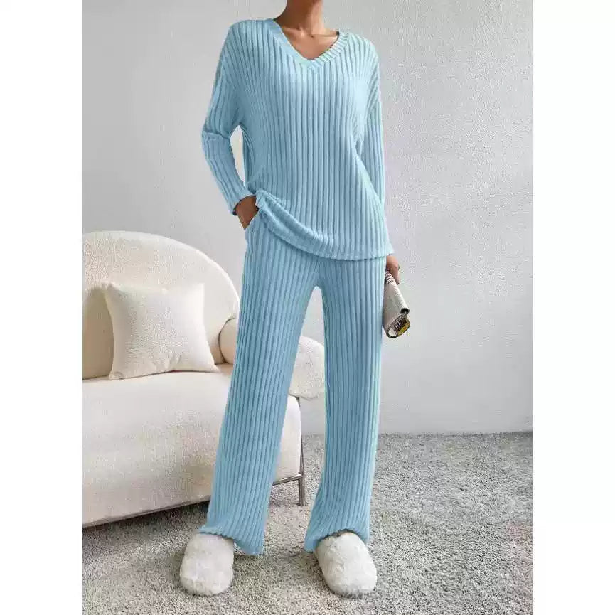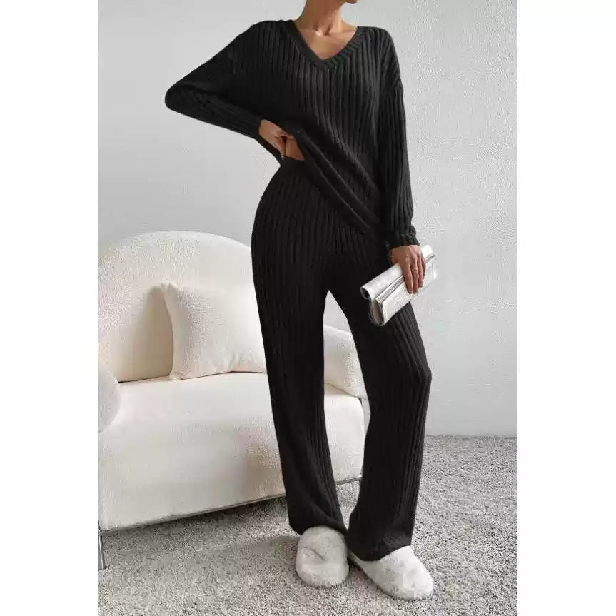 Entdecken Sie das ultimative Strick-Set für mühelosen Stil und höchsten Komfort! Dieses zweiteilige Ensemble, bestehend aus einer lässigen Hose mit geradem Bein und einem passenden Pullover mit lockerem V-Ausschnitt, ist die perfekte Ergänzung für Ihre Garderobe. Es wurde speziell für Frauen entworfen, die Wert auf entspannte Eleganz und vielseitige Kombinationsmöglichkeiten legen.