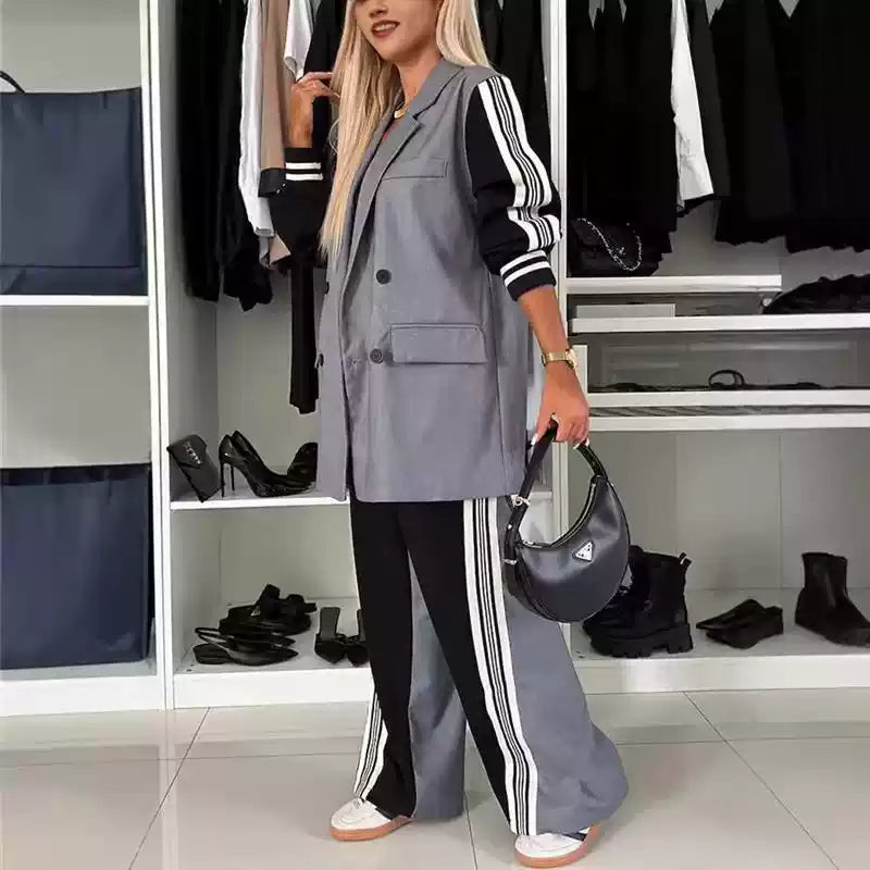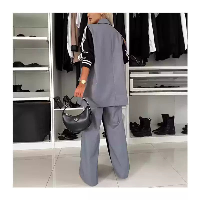 Das Set besteht aus einer locker geschnittenen, doppelreihigen Weste in einem eleganten Grau, die mit breiten Revers und klassischen Knöpfen einen schicken Blazer-Look imitiert. Darunter ist ein clever integriertes oder kombiniertes langärmeliges Oberteil in Schwarz angefügt, das mit markanten Sportstreifen an den Ärmeln einen dynamischen Kontrast bildet und dem Outfit eine sportlich-elegante Note verleiht. Diese einzigartige Kombination schafft den Eindruck eines langärmeligen Blazers, bietet aber die Leichtigkeit einer Weste.