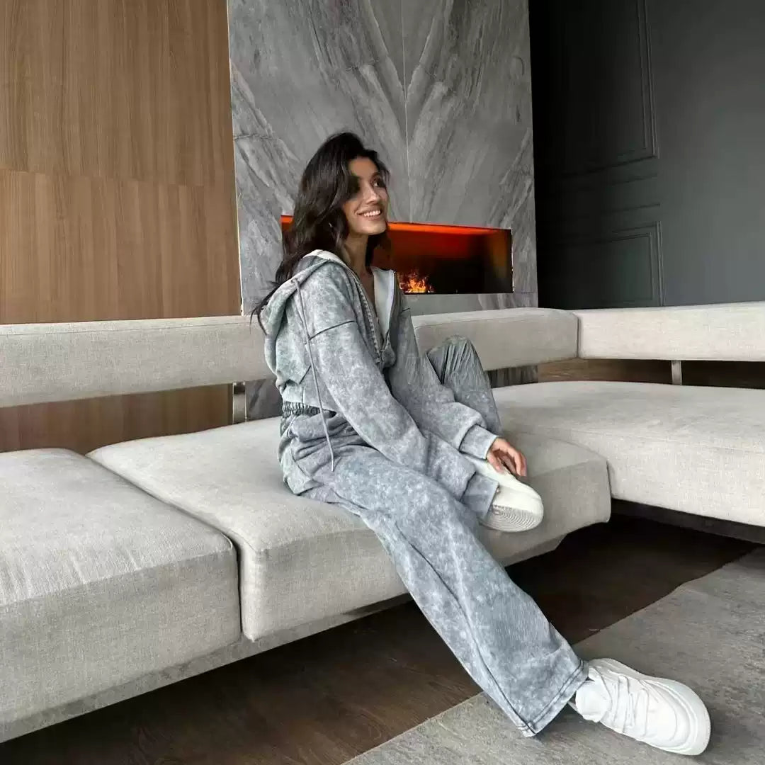 Der Kapuzenpullover zeichnet sich durch seine lockere Passform und die praktische Kapuze aus, die nicht nur Schutz bietet, sondern auch dem Gesamtbild eine sportliche Note verleiht. Die dazu passende Hose, ebenfalls im lässigen Stil gehalten, komplettiert das Ensemble und sorgt für uneingeschränkte Bewegungsfreiheit, sei es beim Entspannen zu Hause, bei sportlichen Aktivitäten oder im Alltag.
