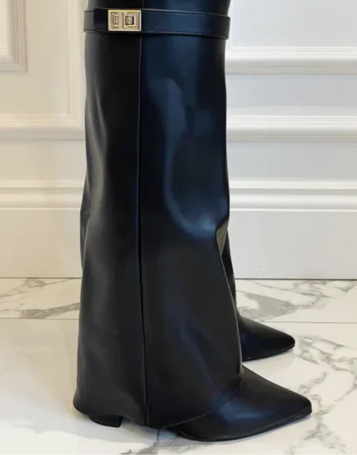 Elegant, modern und ein echtes Statement: Die „Midnight Charm“ Stiefel von Welalux vereinen luxuriöses Design mit klarer Linienführung und femininer Stärke. Das glatte Premium-Kunstleder in tiefem Schwarz wirkt edel und hochwertig, während die goldene Schnallen-Details am Schaft einen dezenten Hauch von Luxus verleihen.