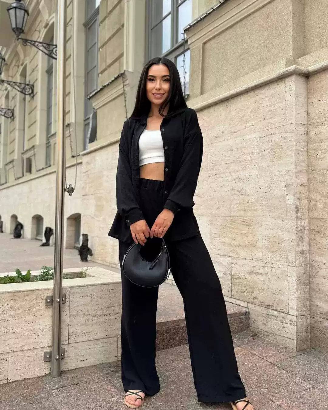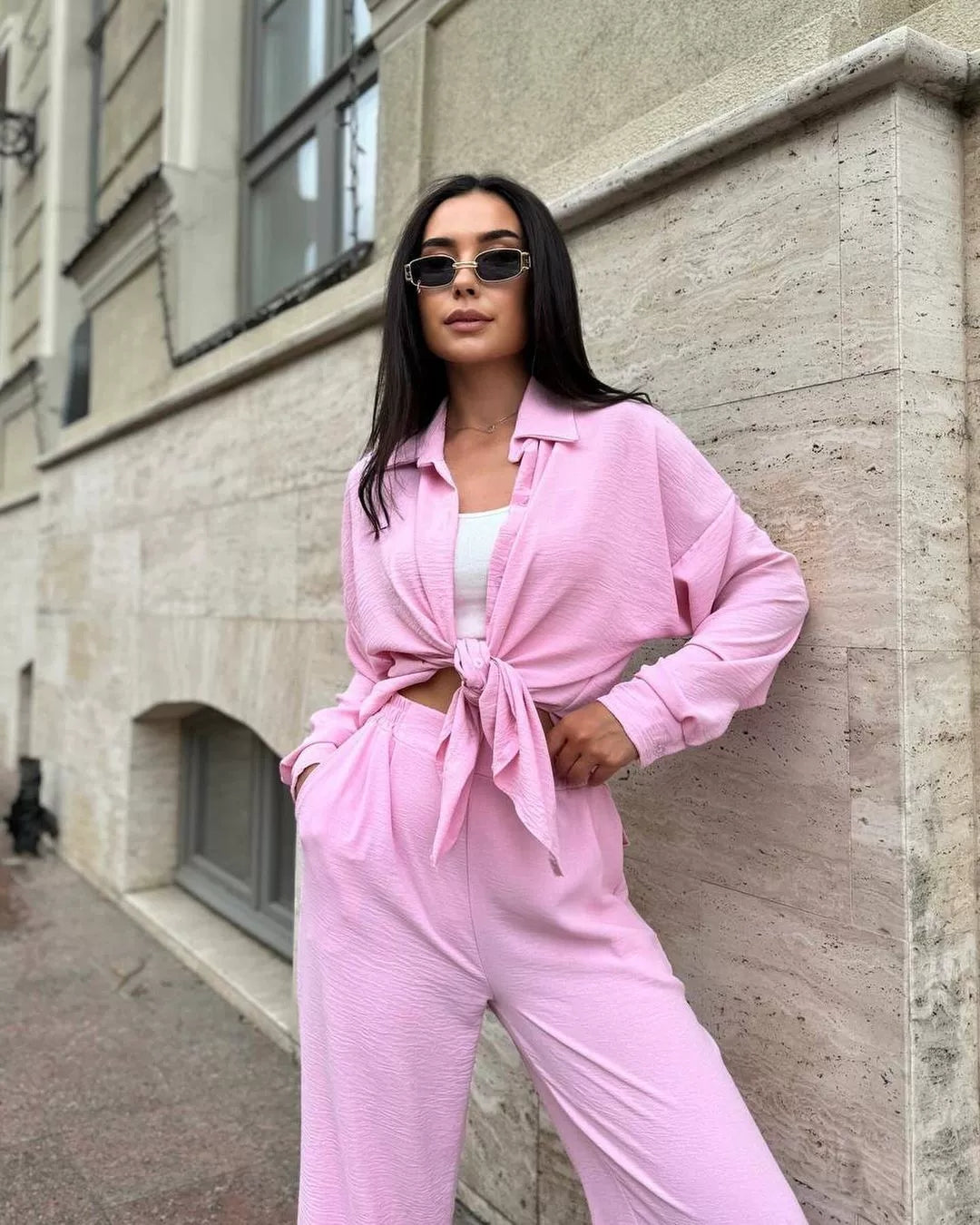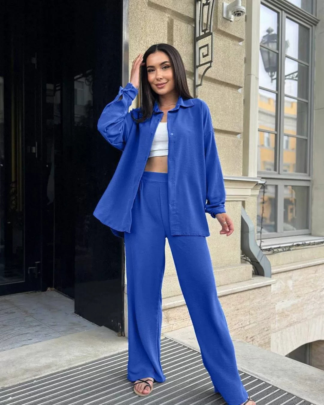 Das Langarmhemd mit Reverskragen zeichnet sich durch sein klares, einfarbiges Design aus, das sich mühelos kombinieren lässt. Die weite Freizeithose bietet maximale Bewegungsfreiheit und einen entspannten Schnitt, der den ganzen Tag über hohen Tragekomfort garantiert. Ob für einen entspannten Stadtbummel, ein Treffen mit Freunden oder als stilvolles Home-Office-Outfit – dieses Set ist die ideale Wahl. Gefertigt aus angenehmen Materialien, bietet es die perfekte Balance zwischen Wärme und Atmungsaktivität für die Übergangszeit. Mit diesem Herbst-Set sind Sie immer stilvoll und bequem gekleidet.