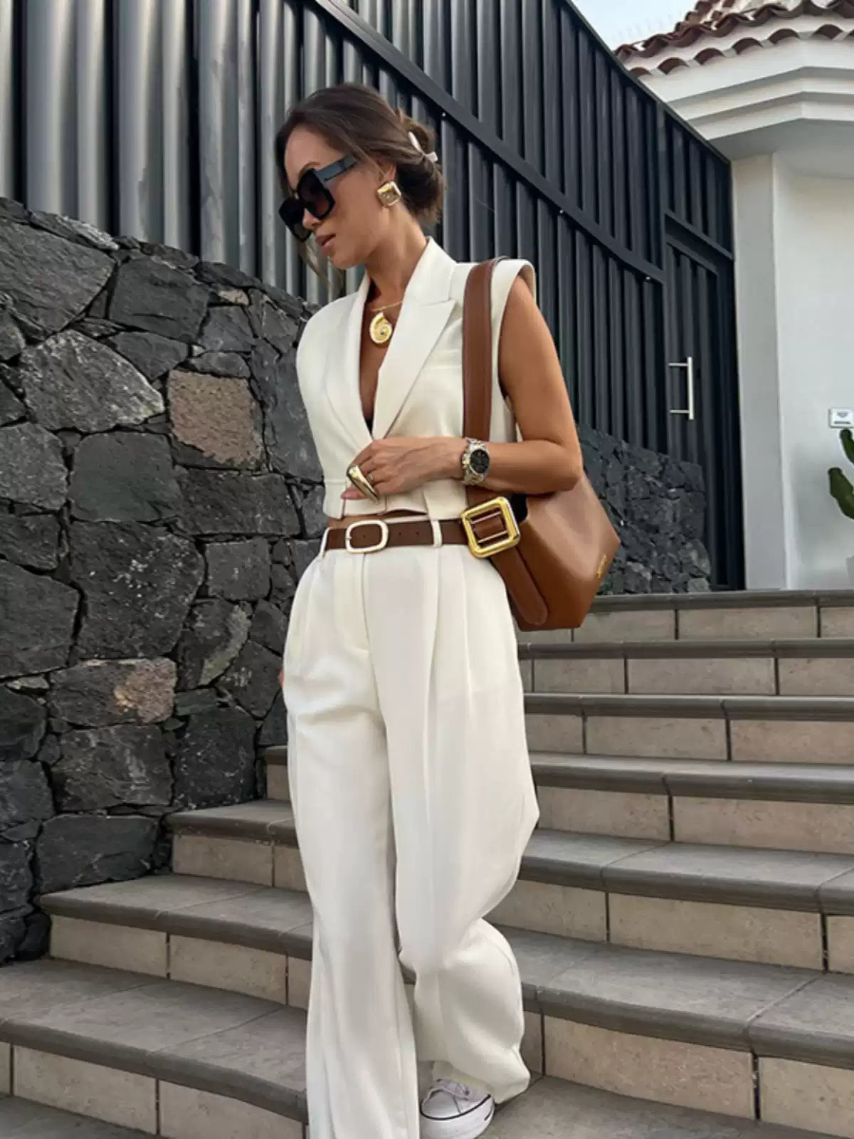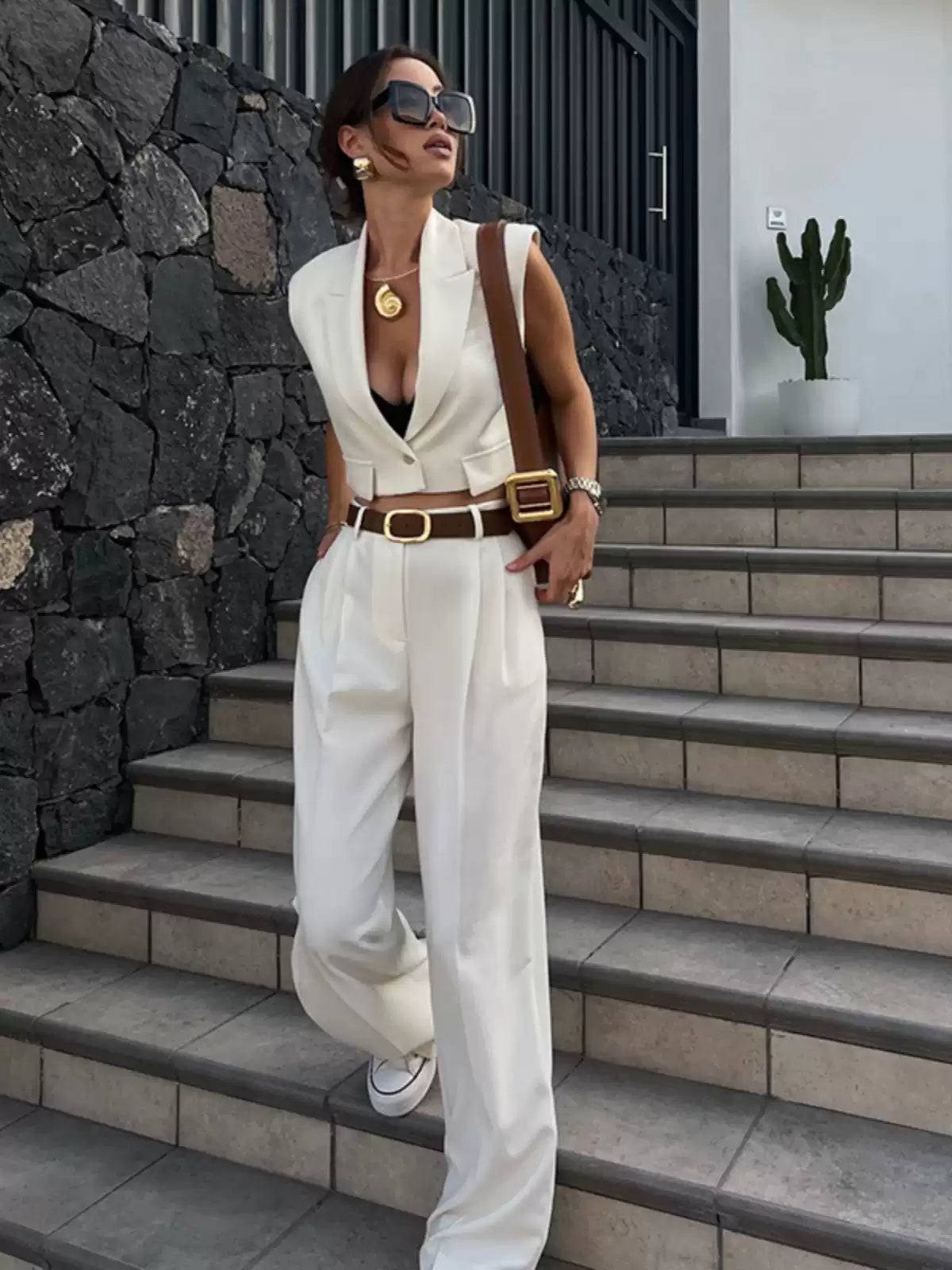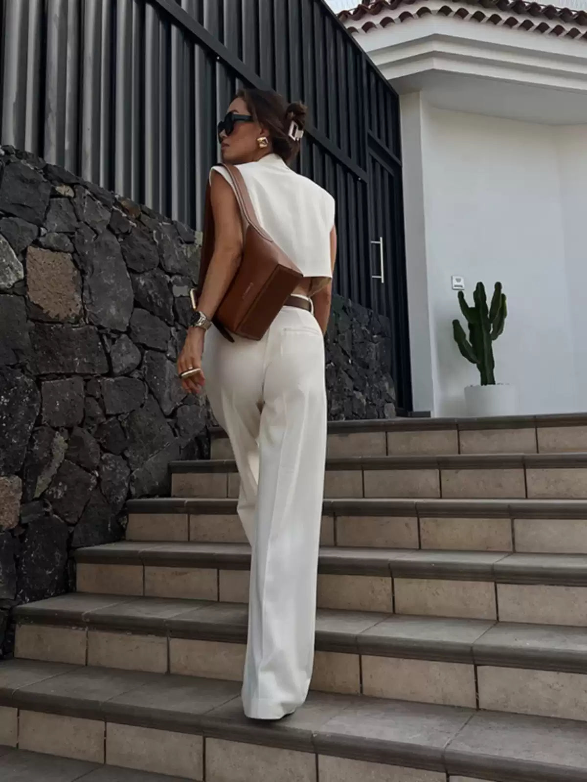 Der Slim-Fit Anzug-Top betont die Taille und sorgt für eine elegante Silhouette, während die High-Waist Anzughose die Beine optisch verlängert und einen bequemen Sitz bietet. Die makellose weiße Farbe strahlt Reinheit und Eleganz aus, ideal für formelle Anlässe, geschäftliche Meetings oder stilvolle Pendler-Outfits. Hergestellt aus hochwertigen Materialien, bietet dieser Anzug nicht nur eine luxuriöse Haptik, sondern auch optimalen Tragekomfort den ganzen Tag über. Kombinieren Sie ihn mit Ihren Lieblingsaccessoires für einen individuellen und anspruchsvollen Look, der sowohl im Büro als auch bei besonderen Events begeistert.
