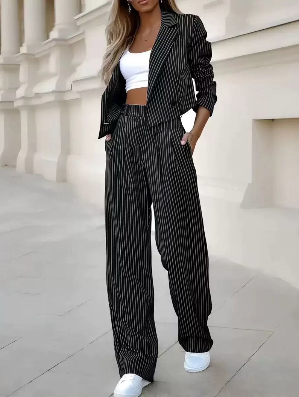 Setze ein stilvolles Statement mit dem „Urban Elegance“ Zweiteiler – der perfekte Mix aus Business-Chic und lässiger Streetstyle-Coolness. Das Set besteht aus einer taillierten Cropped-Blazerjacke mit modischen 3/4-Ärmeln und einer weit geschnittenen High-Waist-Hose. Die feinen weißen Nadelstreifen auf dem zartgrauen Stoff verleihen dem Outfit eine edle Note, während der elastische Bund für höchsten Tragekomfort sorgt. Kombiniert mit einem sportlichen Crop-Top und Sneakern wird dieses Set zum absoluten Hingucker – ideal für City-Looks, das Büro oder dein nächstes Coffee-Date.