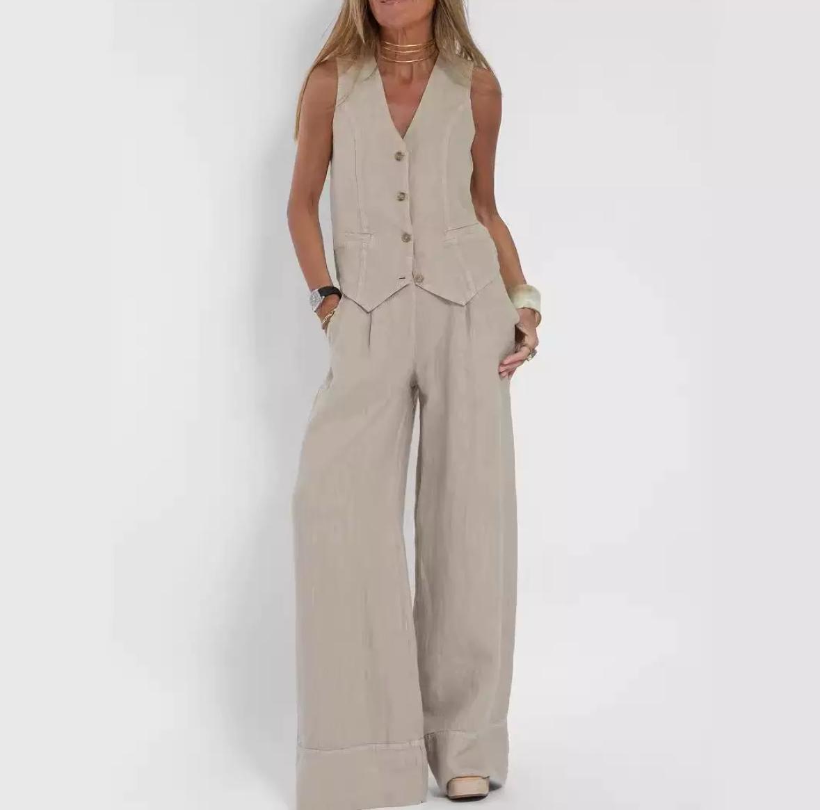 Dieser stilvolle Zweiteiler aus hochwertigem Leinenmix vereint sommerliche Leichtigkeit mit eleganter Raffinesse. Das ärmellose, taillierte Weste-Top mit V-Ausschnitt und Knopfleiste betont sanft die Figur, während die weit geschnittene Hose mit weitem Bein eine luftige Silhouette zaubert – perfekt für warme Tage.