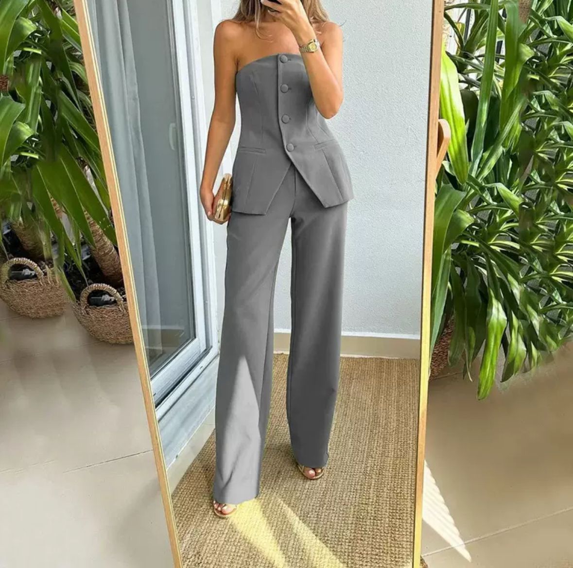 Das schulterfreie Oberteil mit markanter Knopfleiste und figurschmeichelnder Taillierung setzt Ihre Silhouette perfekt in Szene, während die weit geschnittene Hose für einen eleganten, fließenden Fall sorgt und gleichzeitig maximalen Komfort bietet.