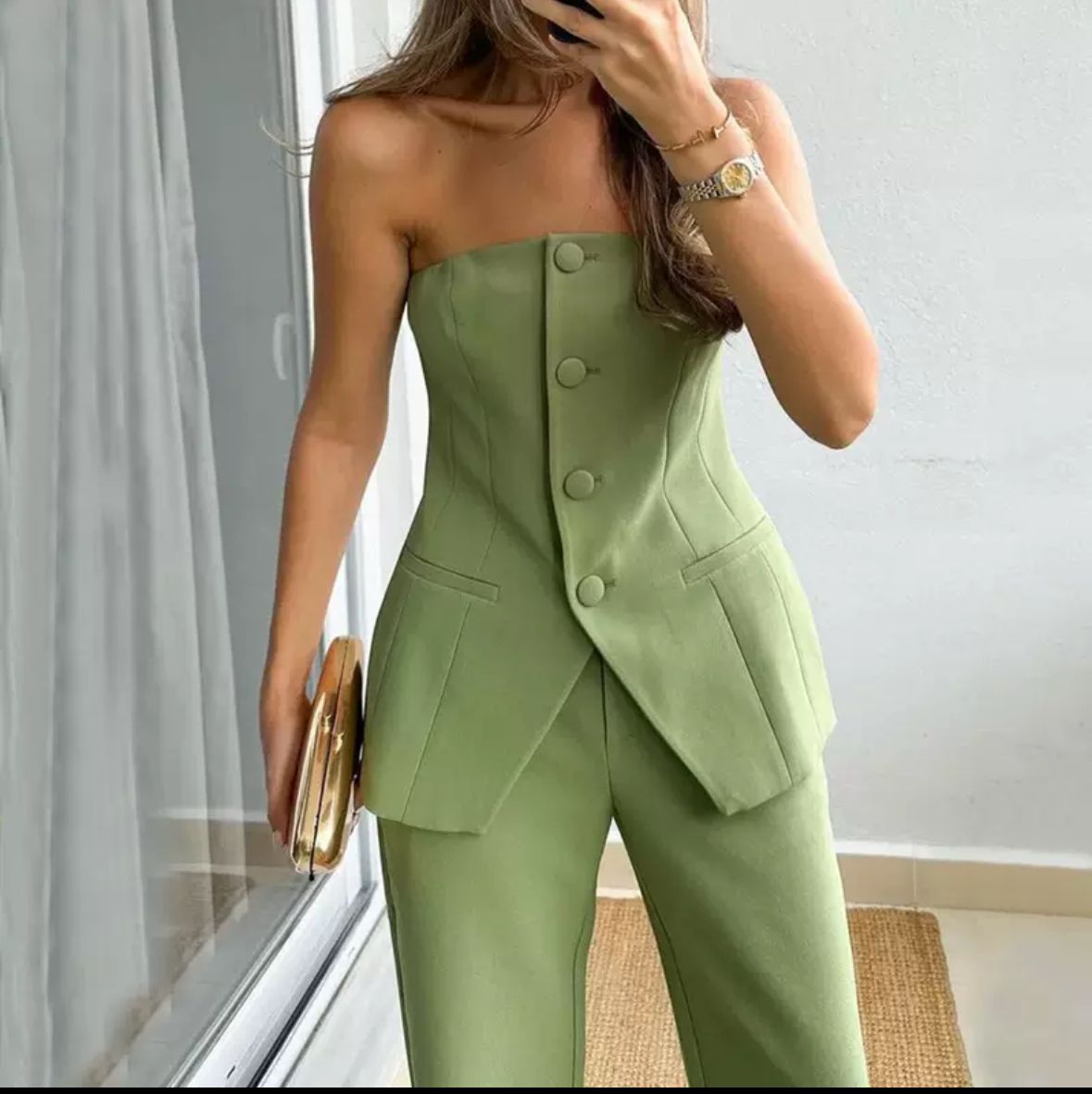 Tauche ein in die Welt moderner Eleganz mit unserem exklusiven Zweiteiler “Verde Grace”. Dieses atemberaubende Ensemble in frischem Olivgrün vereint stilvolle Raffinesse mit sommerlicher Leichtigkeit – perfekt für Frauen, die Selbstbewusstsein und Klasse ausstrahlen möchten.