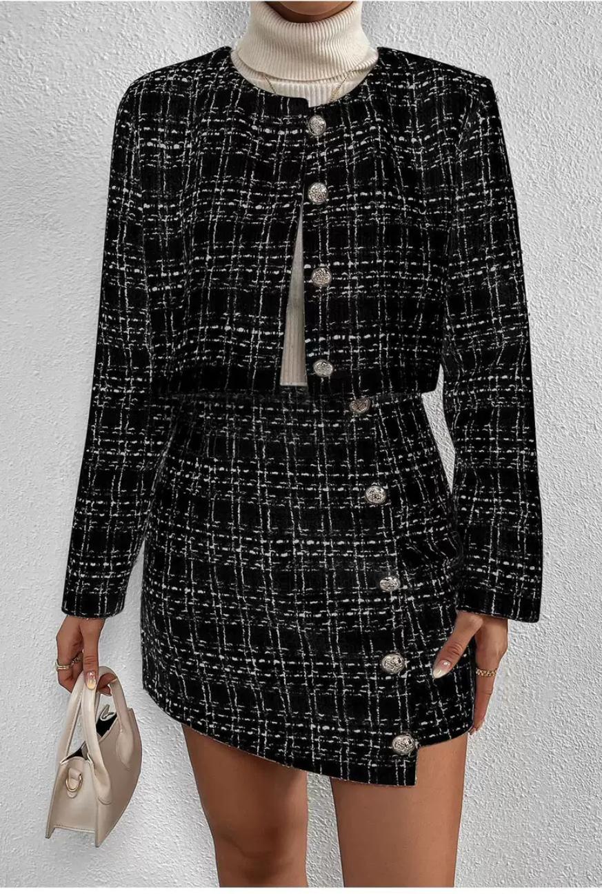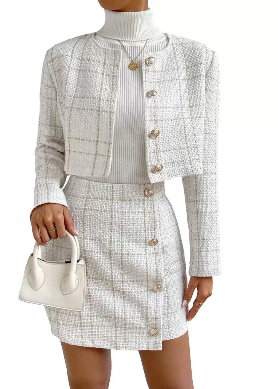 Das strukturierte Tweed-Design in zartem Rosé mit feinen schwarzen Akzenten strahlt Klasse aus und erinnert an die ikonische Mode großer Couture-Häuser. Die figurnahe Passform betont deine Silhouette, während der goldglänzende Knopfverschluss edle Akzente setzt. Die Kombination aus kurzem Blazer und Minirock verleiht dir eine selbstbewusste, aber dennoch stilvolle Ausstrahlung – ideal für besondere Anlässe, Dates oder einen stilvollen Auftritt im Alltag.