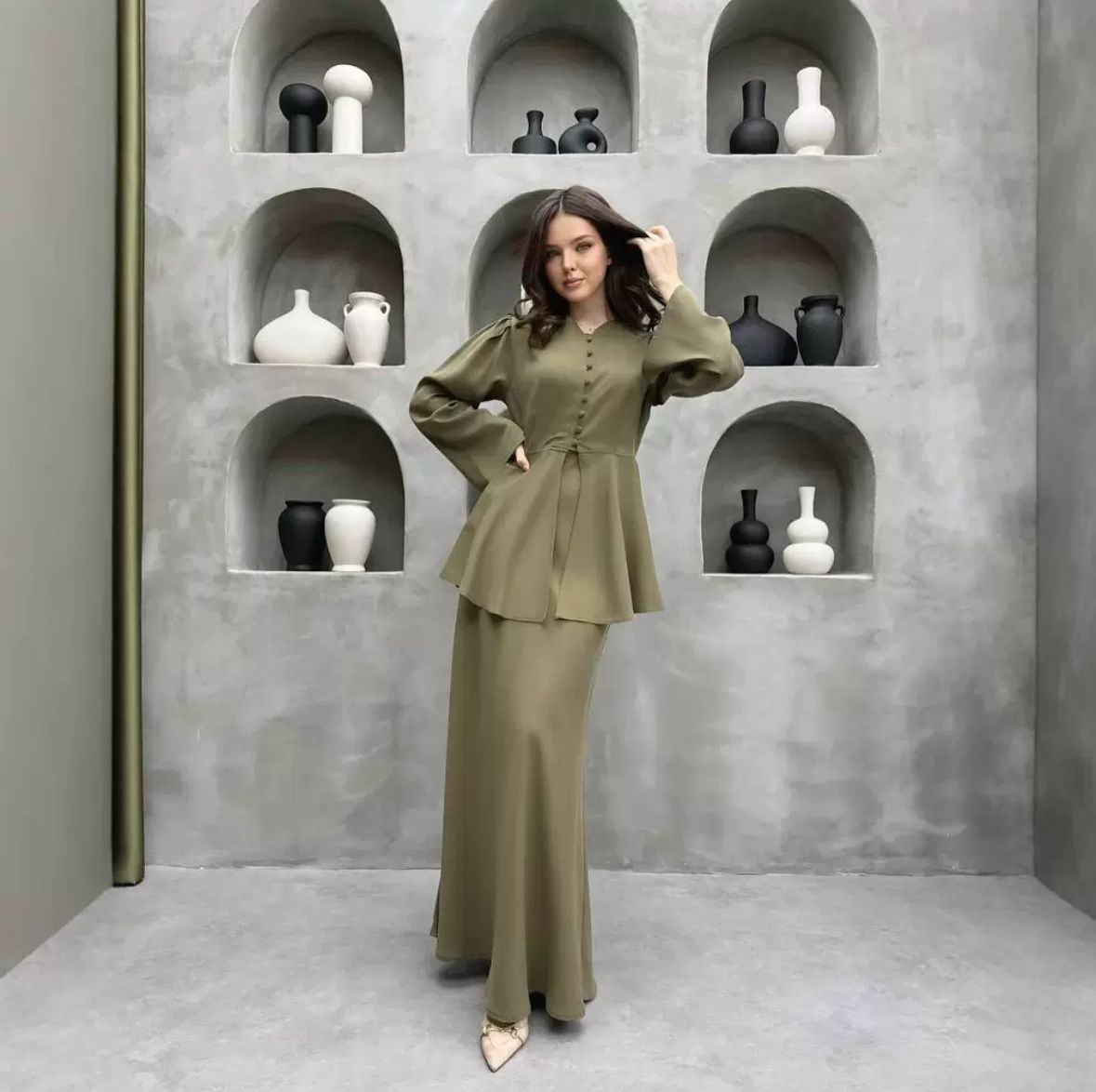 Die fließenden Ärmel und die durchdachte Knopfleiste setzen dezente Highlights, während der figurbetonte Schnitt eine elegante Silhouette zaubert. In Kombination mit feinen Accessoires entsteht ein Look, der Stilbewusstsein und Klasse ausstrahlt.
