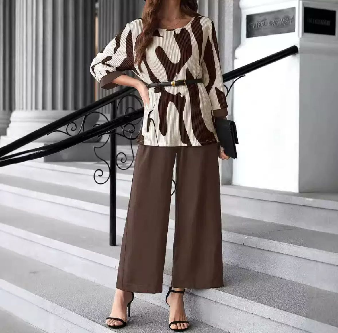 Erleben Sie stilvolle Leichtigkeit mit unserem exklusiven Zweiteiler “Savannah”, der Modebewusstsein und Komfort perfekt vereint. Das kunstvolle Muster des Oberteils in harmonischen Braun- und Cremetönen erinnert an moderne Naturmotive und verleiht jedem Look eine elegante, urbane Ausstrahlung. Der lockere Schnitt schmeichelt der Figur, während der taillierende Gürtel für eine feminine Silhouette sorgt.