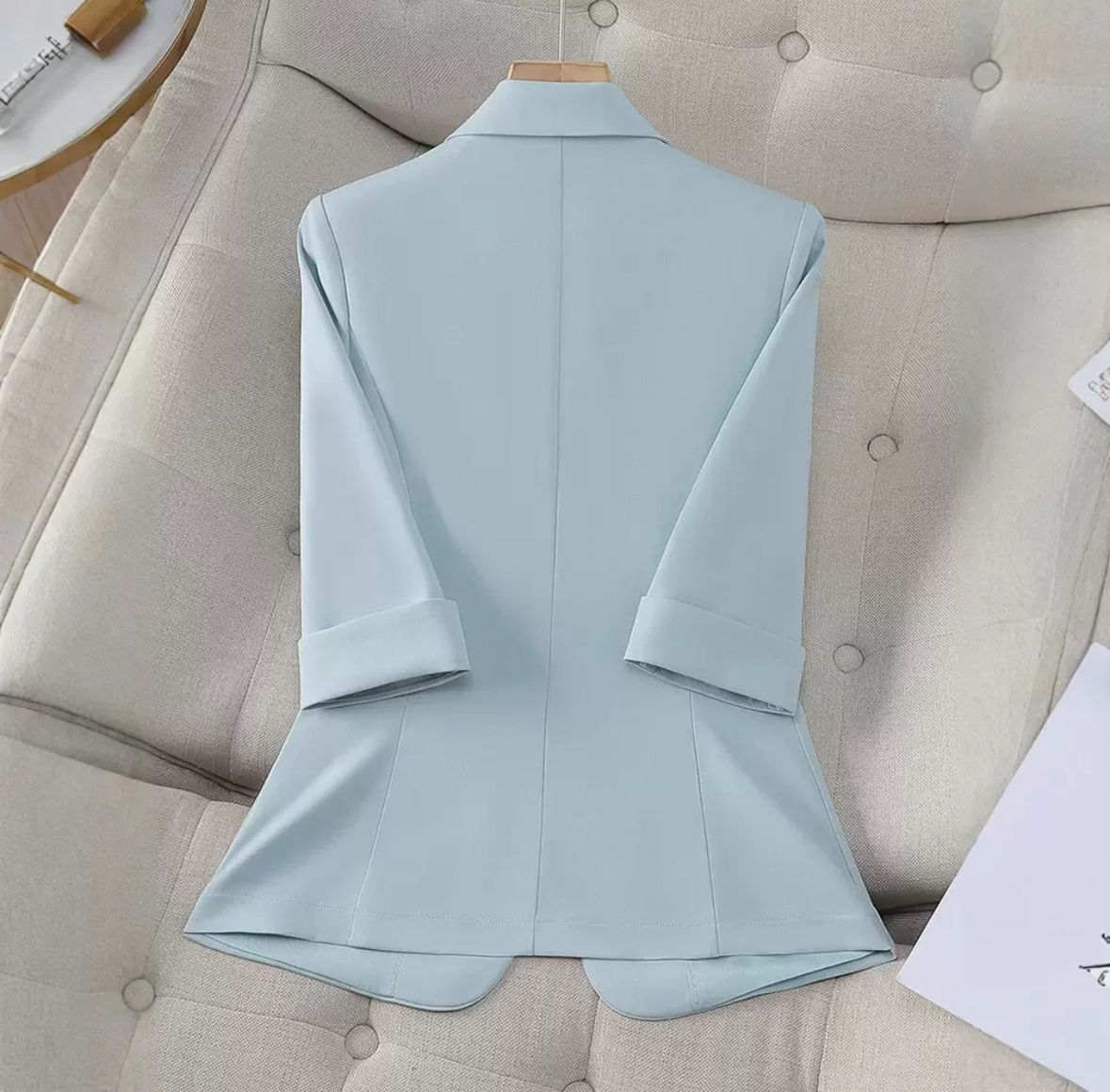 Mit seinem 3/4-Arm und dem dezenten Revers schafft der Blazer die perfekte Balance zwischen Professionalität und moderner Leichtigkeit. Der einzelne, edle Knopfverschluss und die feinen, minimalistischen Taschen unterstreichen den exklusiven Look – ohne aufdringlich zu wirken.
