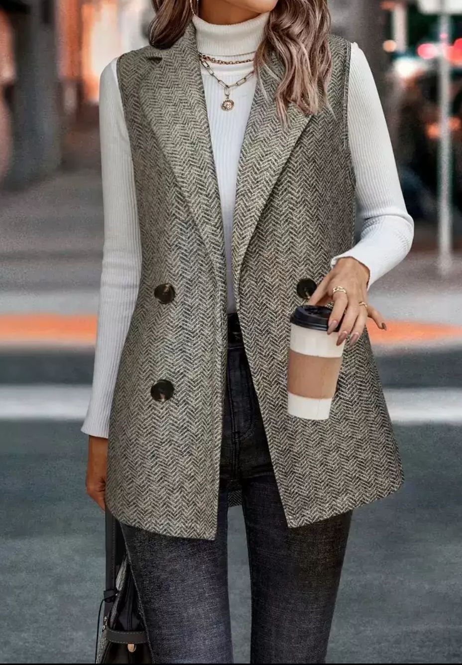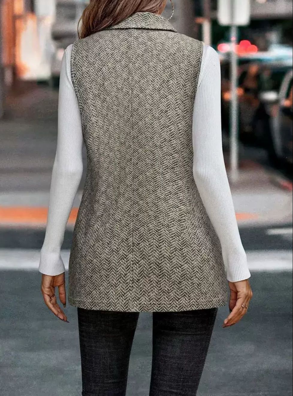 Verleihen Sie Ihrem Alltagslook einen Hauch von Luxus mit unserer eleganten Long-Weste Élégance Urban. Dieses stilvolle It-Piece kombiniert klassische Schneiderkunst mit modernem Großstadtflair. Das feine Fischgrätmuster in zeitlosem Grau bringt dezente Raffinesse in jedes Outfit, während der taillierte Schnitt Ihre Silhouette schmeichelhaft betont.