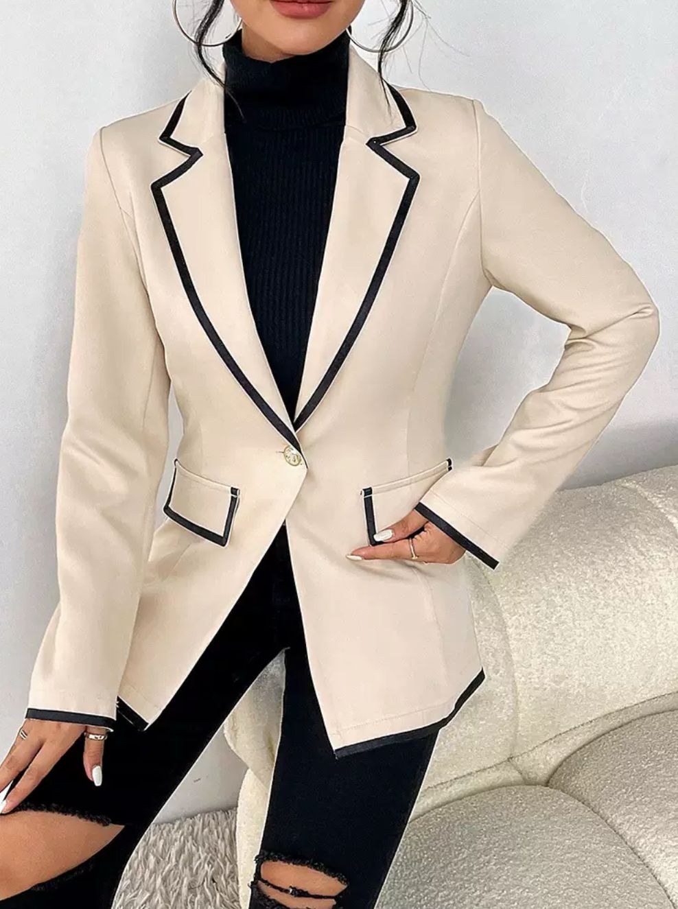 Setze ein Statement mit Stil – der Eleganzlinie Damen Blazer vereint klassische Raffinesse mit modernem Chic. Die schmeichelnde Sandfarbe, veredelt durch markante schwarze Kontrastkanten, macht diesen Blazer zu einem echten Blickfang – ob im Büro, beim Business-Lunch oder als stilvoller Alltagsbegleiter.