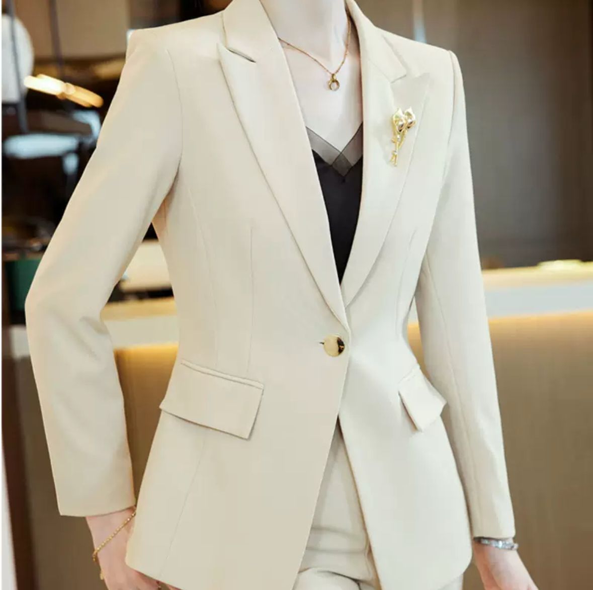 Das hochwertige Material schmiegt sich angenehm an die Haut, während das dezente Innenfutter für optimalen Tragekomfort sorgt. Die 3/4-Ärmel und der goldene Knopf unterstreichen das Design mit femininer Leichtigkeit. Das feine Revers und die edle Brosche in Blumenform verleihen dem Look das gewisse Etwas – stilvoll, aber nie überladen.