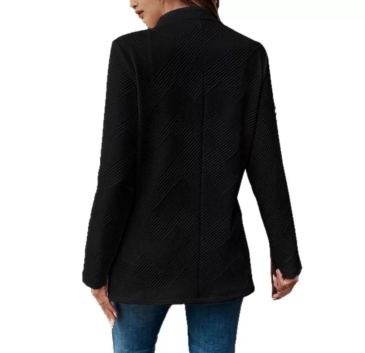 Verleihe deinem Outfit eine elegante Note mit dem Noir Chic Blazer – dem Inbegriff moderner Weiblichkeit und stilvoller Zurückhaltung. Die strukturierte Webung in dezentem Zickzack-Muster verleiht diesem schwarzen Blazer eine luxuriöse Tiefe, während der offene Schnitt mit geschwungenem Saum für einen zeitlos femininen Look sorgt.