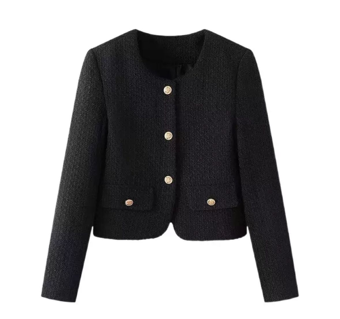 Setze ein stilvolles Statement mit der Claire Bouclé-Jacke – einer Hommage an klassische Eleganz und moderne Raffinesse. Die Jacke überzeugt mit ihrem hochwertigen Bouclé-Stoff, der durch seine strukturierte Oberfläche besonders edel wirkt. Goldene Knöpfe auf der Vorderseite und an den Pattentaschen setzen luxuriöse Akzente, während der taillierte, leicht verkürzte Schnitt die weibliche Silhouette perfekt betont.