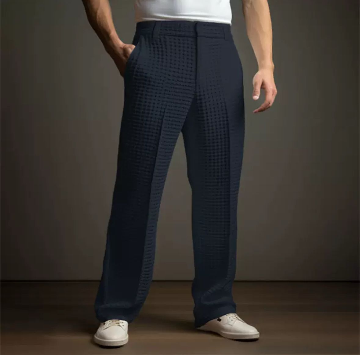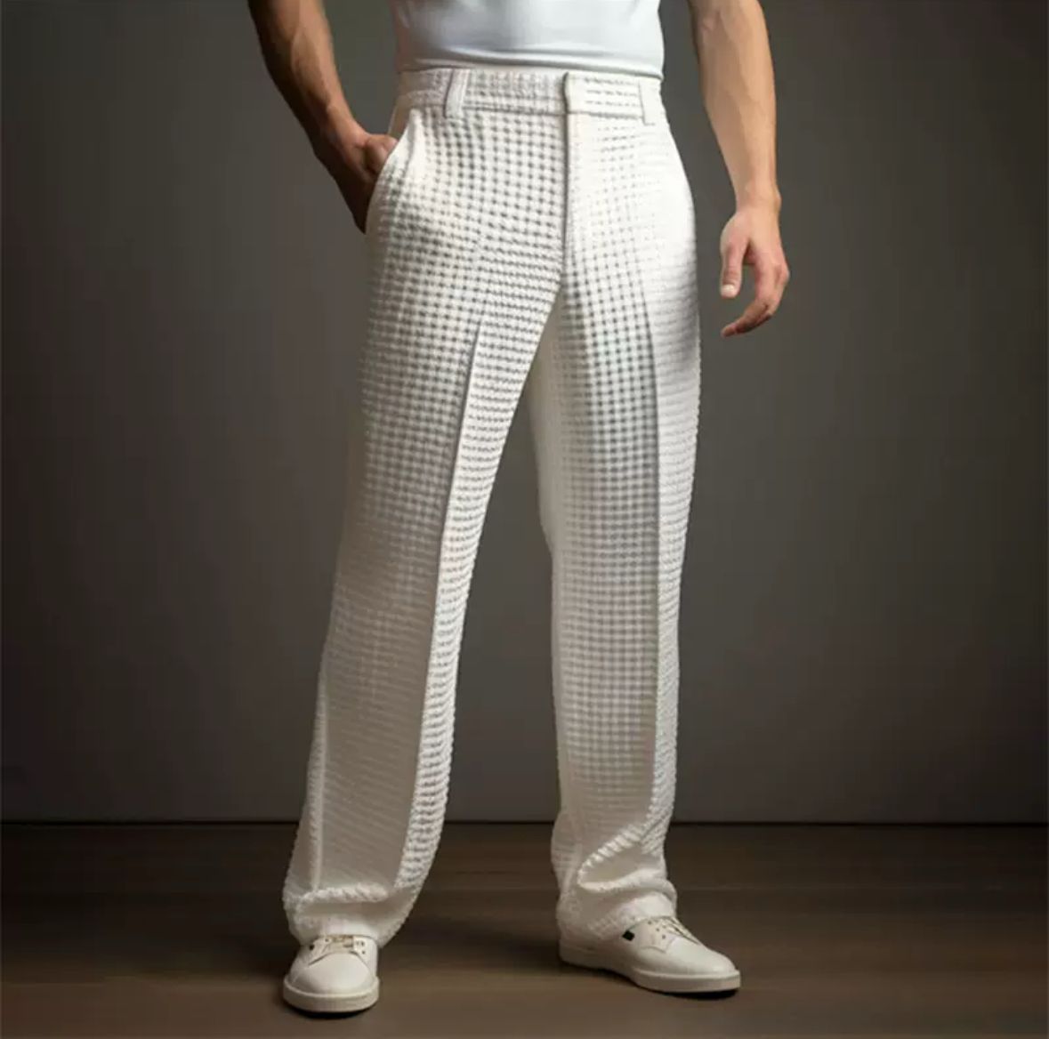 Die „Weißer Kubus“ ist eine exklusive Herrenhose, die mit ihrem markanten, texturierten Waffelmuster sofort ins Auge fällt. Gefertigt aus einem hochwertigen, strukturierten Stoff bietet sie nicht nur ein außergewöhnliches Tragegefühl, sondern auch ein stilvolles Statement für modebewusste Männer. Der gerade Schnitt und die dezenten Bundfalten sorgen für eine elegante Silhouette, während der elastische Griff und die lockere Passform maximale Bewegungsfreiheit garantieren. Ideal kombinierbar mit Sneakern oder Loafern für einen urbanen, smarten Look.