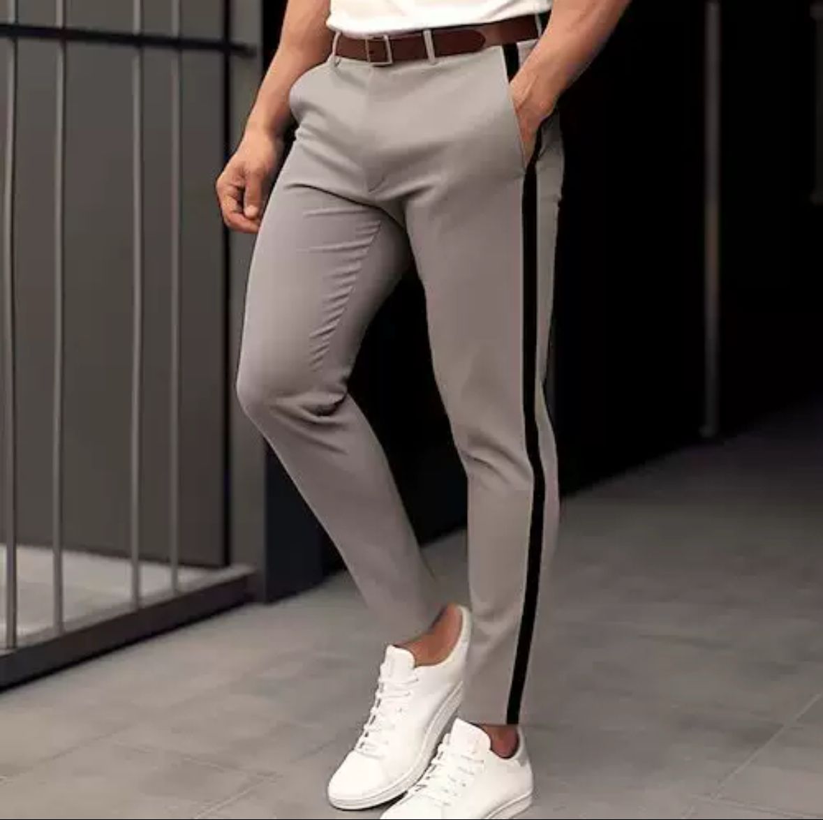 Setze ein stilvolles Statement mit der Stilstreifen Hose – Urban Grau. Diese moderne Herrenhose kombiniert sportlichen Charme mit eleganter Schlichtheit. Der schlanke Schnitt sorgt für eine figurbetonte Passform, während der seitliche schwarze Streifen dem Design eine dynamische Note verleiht. Gefertigt aus einem angenehmen Stretch-Material bietet sie hohen Tragekomfort – perfekt für Alltag, Büro oder den urbanen Freizeitlook.