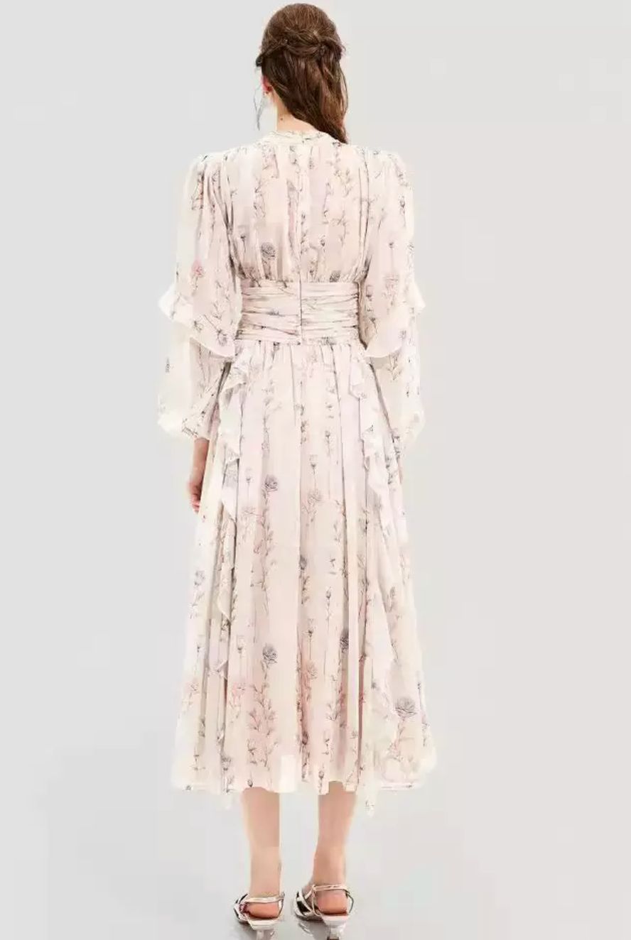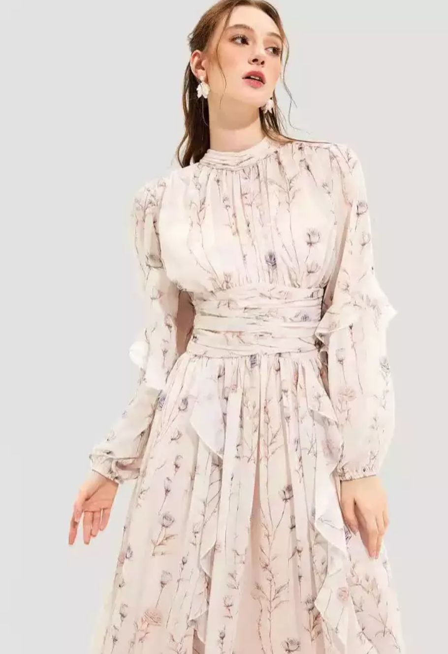 Verleihe deinem Look eine elegante und feminine Note mit diesem zauberhaften Maxikleid. Das luftige Design in edlem Elfenbeinton ist mit einem feinen floralen Muster verziert und sorgt für einen romantischen Auftritt – perfekt für besondere Anlässe oder stilvolle Alltagsmomente.