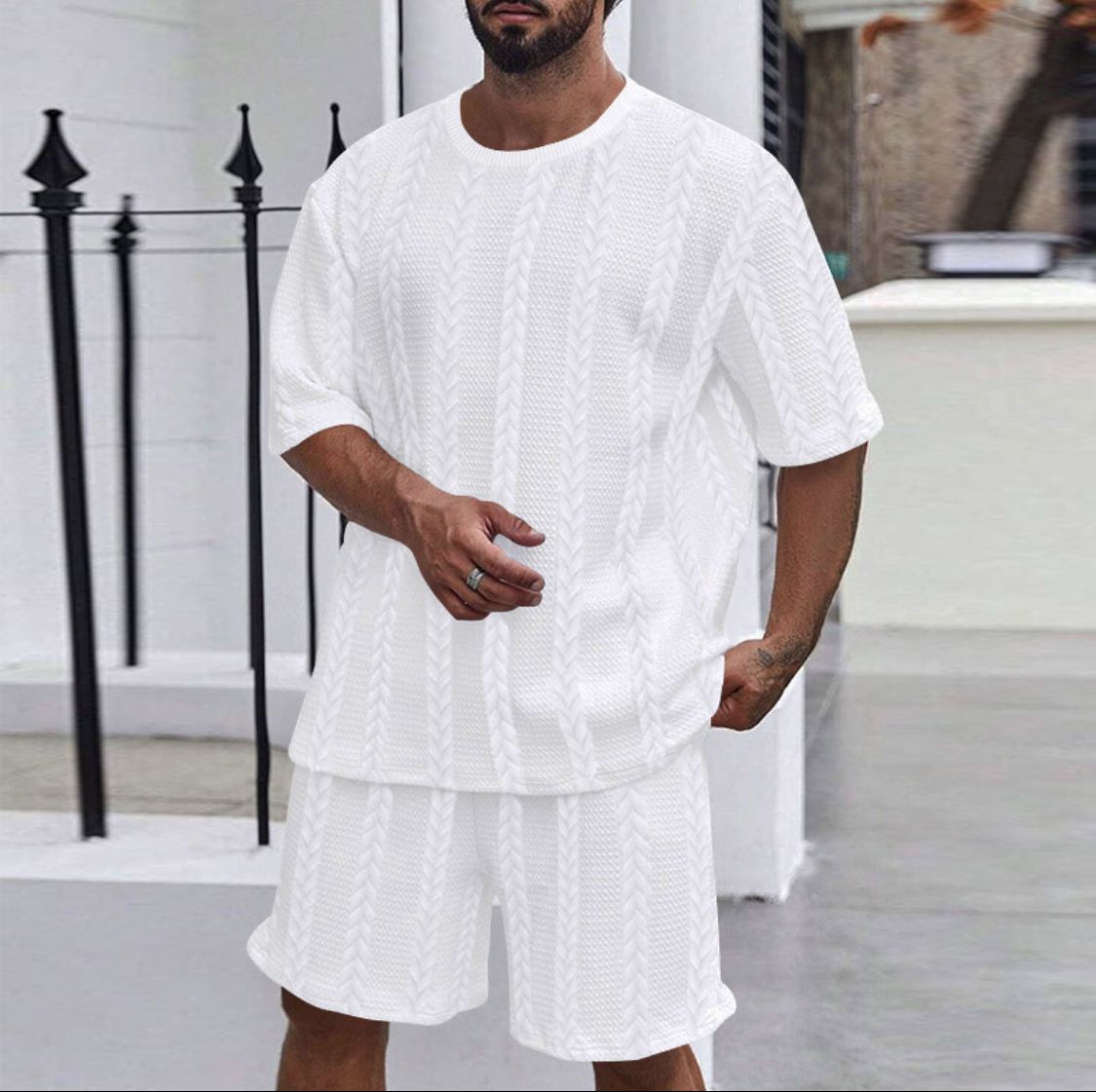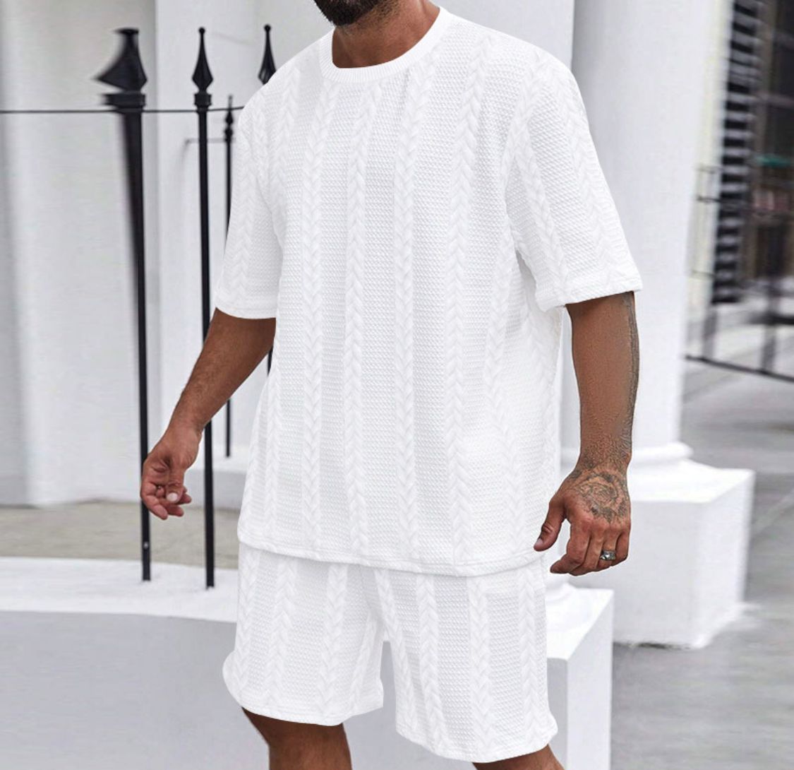 Erlebe den Sommer in seiner stilvollsten Form – mit dem „Strukturweiß Ensemble“, dem perfekten Zweiteiler für Männer, die Wert auf Eleganz und Komfort legen. Dieses Set aus locker geschnittener T-Shirt und passender Shorts besticht durch seine außergewöhnliche Strickstruktur in Zopfmuster-Optik, die Tiefe und Charakter verleiht, ohne aufdringlich zu wirken.