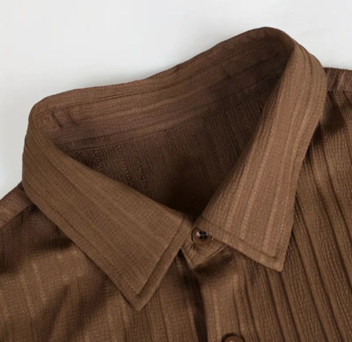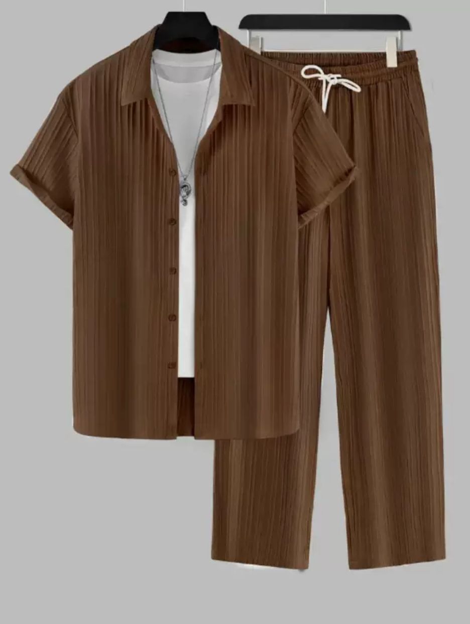 Erleben Sie den Inbegriff sommerlicher Lässigkeit mit dem San Remo Komfort-Set – ein zweiteiliges Herren-Outfit, das Stil und Bequemlichkeit harmonisch vereint. Das Set besteht aus einem luftigen, kurzärmligen Hemd mit durchgehender Knopfleiste und passender Hose mit elastischem Bund und Kordelzug – beide aus einem angenehm leichten, fein plissierten Stoff in edlem Kaffeebraun.