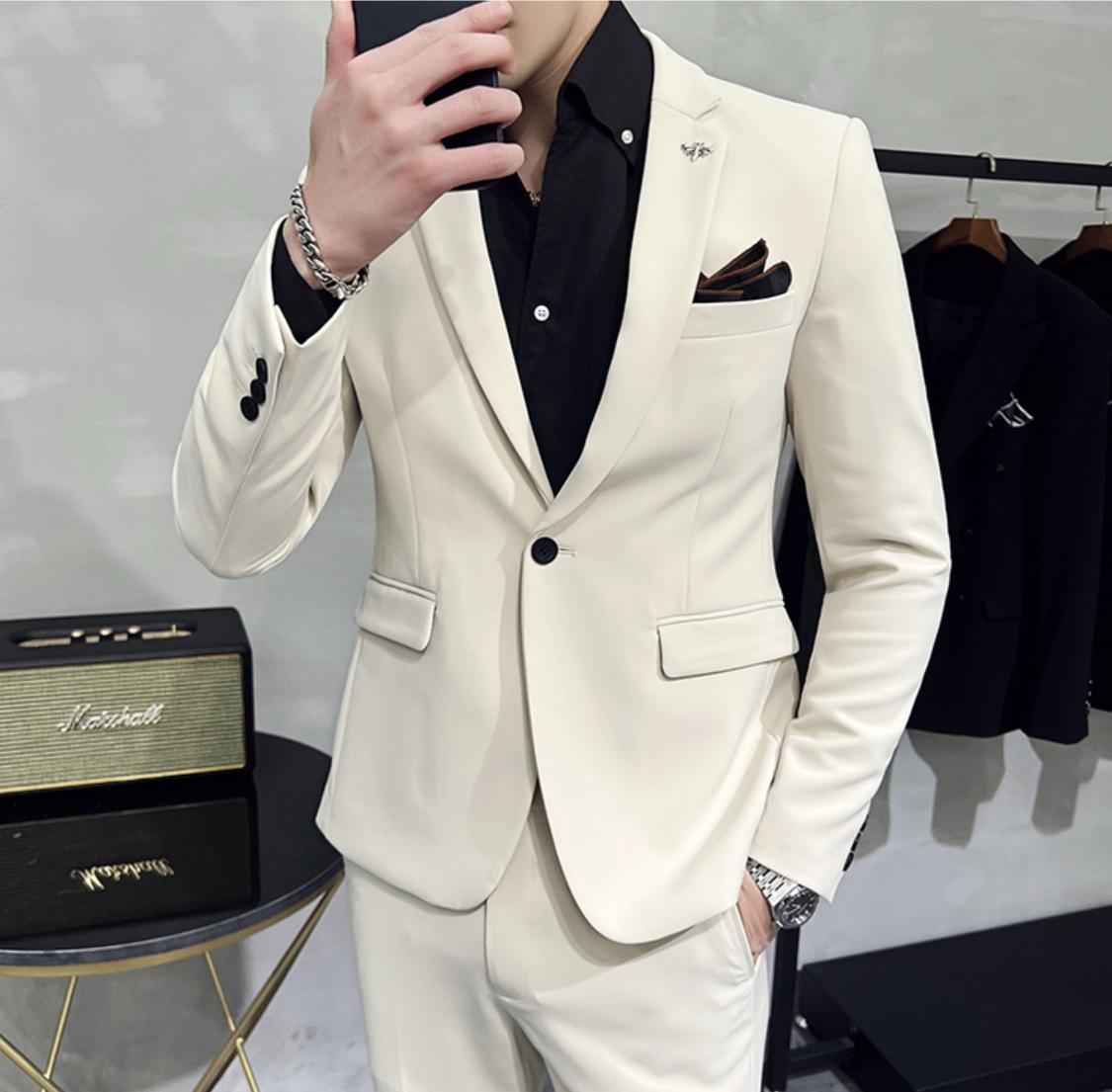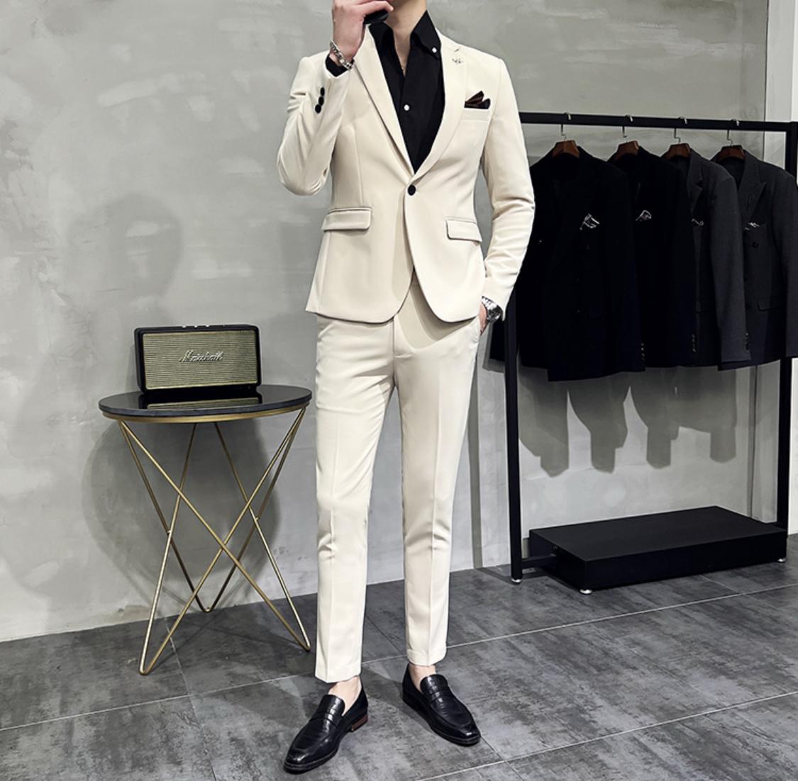 Eleganz trifft auf moderne Raffinesse – Elfenbein-Essenz ist der Inbegriff stilvoller Männermode für besondere Anlässe. Dieser elfenbeinfarbene Slim-Fit-Anzug mit edlem Revers und klarer Linienführung sorgt für einen makellosen Auftritt. Die Kombination mit einem schwarzen Hemd und passenden Loafern unterstreicht die selbstbewusste Silhouette und strahlt gleichzeitig pure Klasse aus.
