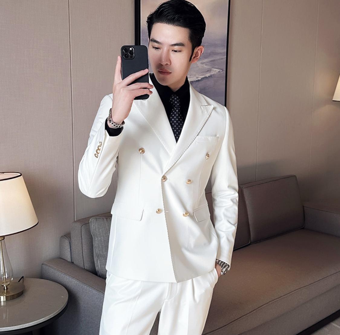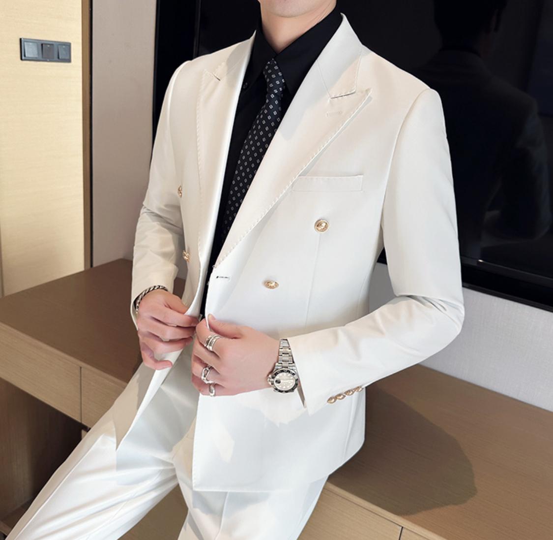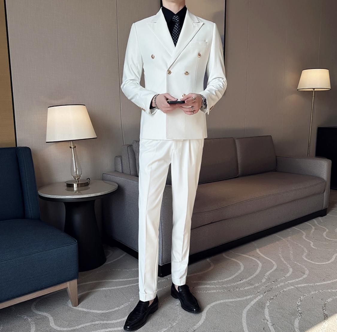 Erleben Sie zeitlose Klasse neu definiert – mit dem Weißer Doppio, einem meisterhaft geschneiderten Anzug für den Mann mit Stilanspruch. Der doppelt geknöpfte Zweireiher in makellosem Weiß mit goldenen Akzenten zieht alle Blicke auf sich und verkörpert Selbstbewusstsein, Reinheit und Eleganz zugleich.