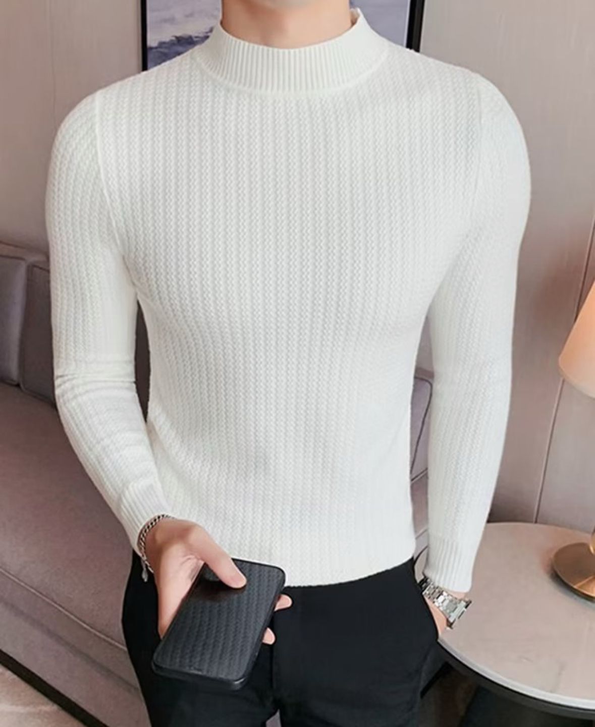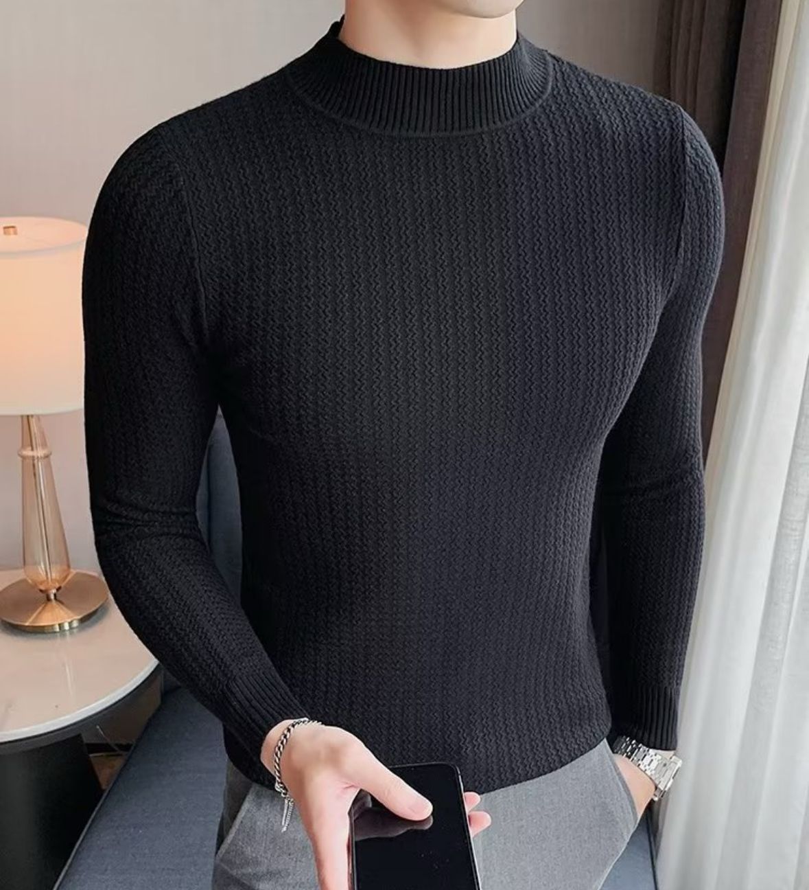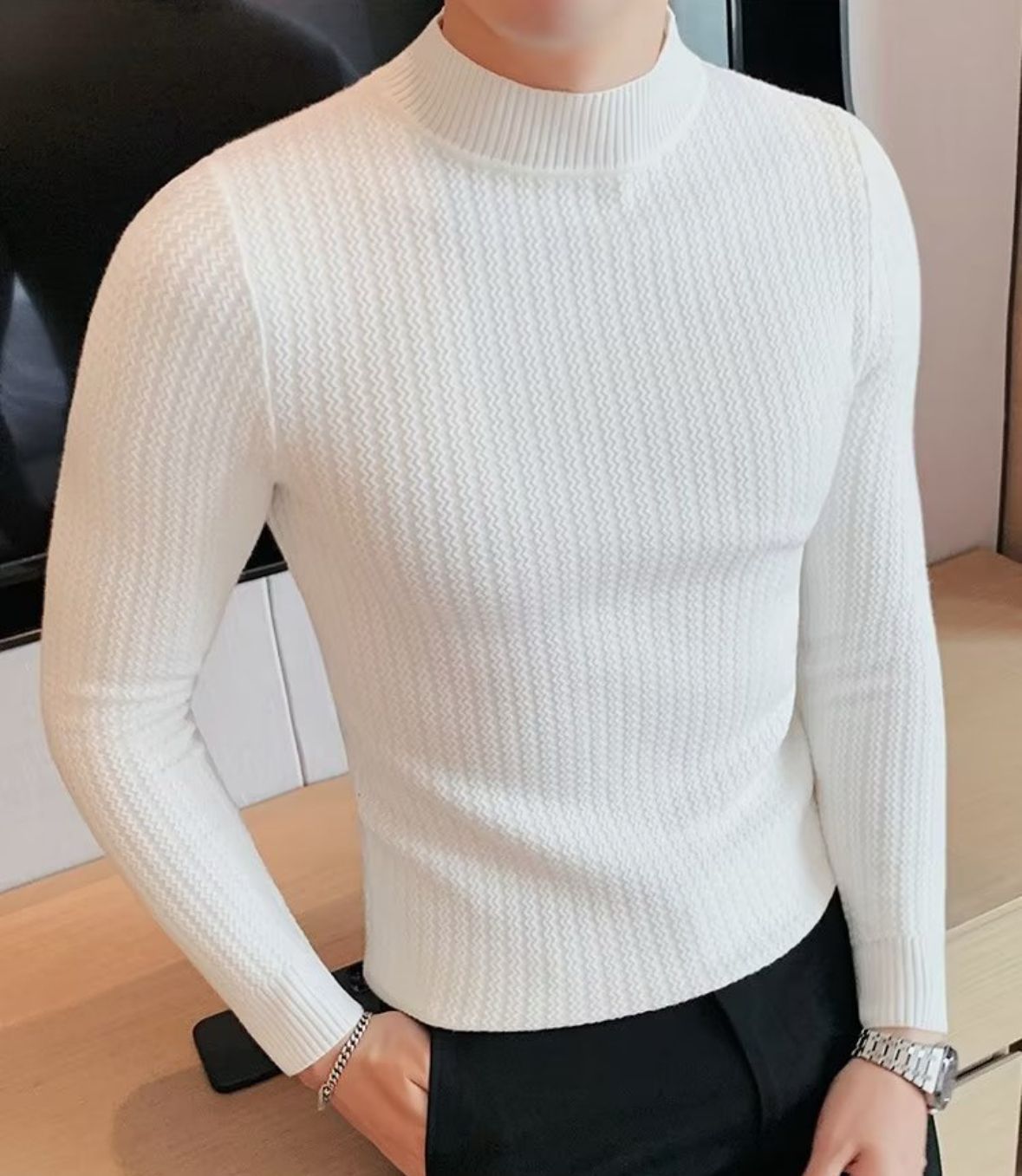 Dank des elastischen Materials sitzt der Pullover körpernah und bequem – ideal für Business, Freizeit oder den stilvollen Auftritt am Abend. Der dezente Stehkragen unterstreicht den modernen Charakter und verleiht dir einen souveränen Look, der wirkt, ohne zu übertreiben.