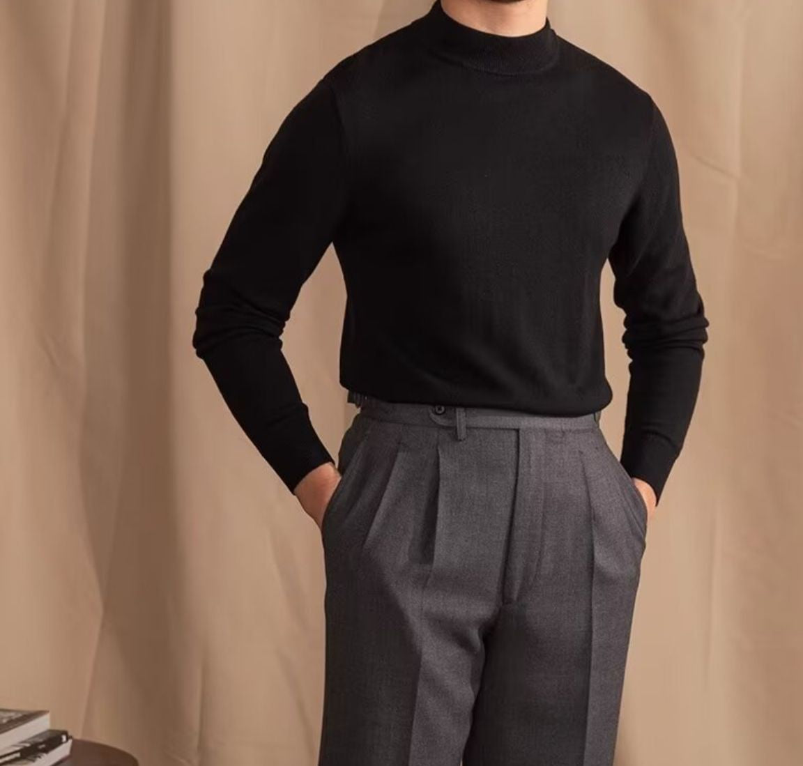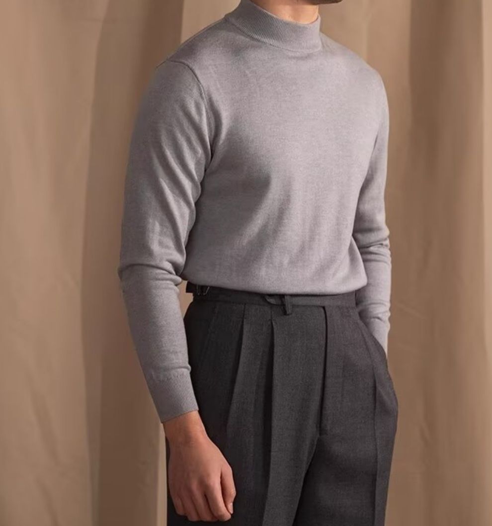Ideal zu grauen Wollhosen, wie im Bild, sorgt der Schwarzglanz Pullover für einen stilvollen Auftritt – ob im Büro, beim Abendessen oder auf besonderen Anlässen. Ein Muss für jede gut sortierte Herrengarderobe.