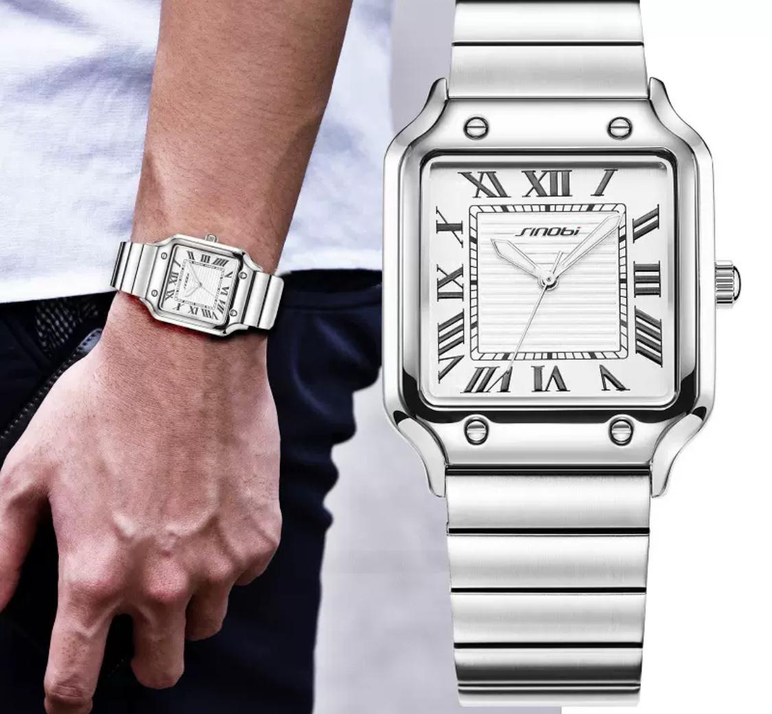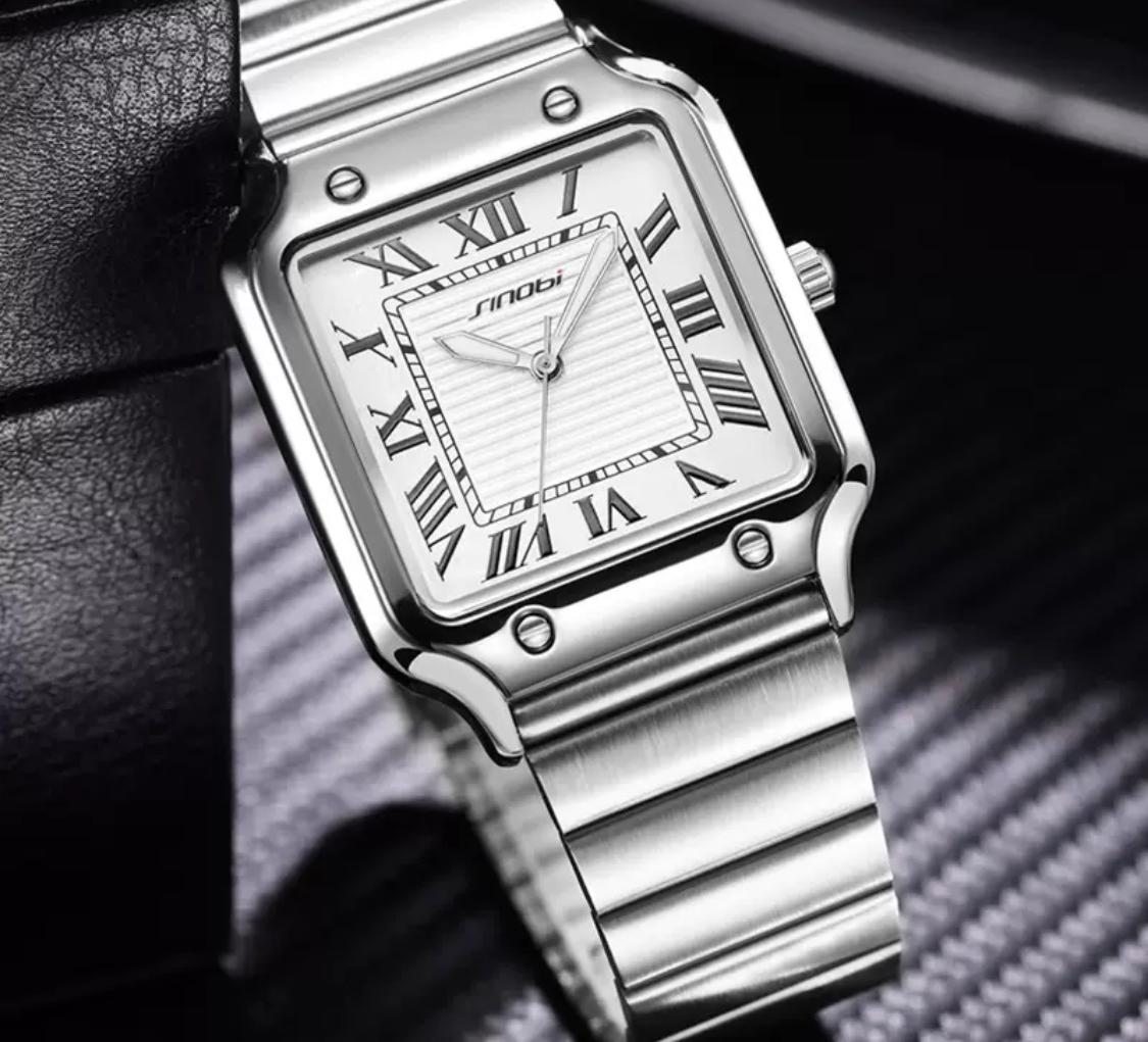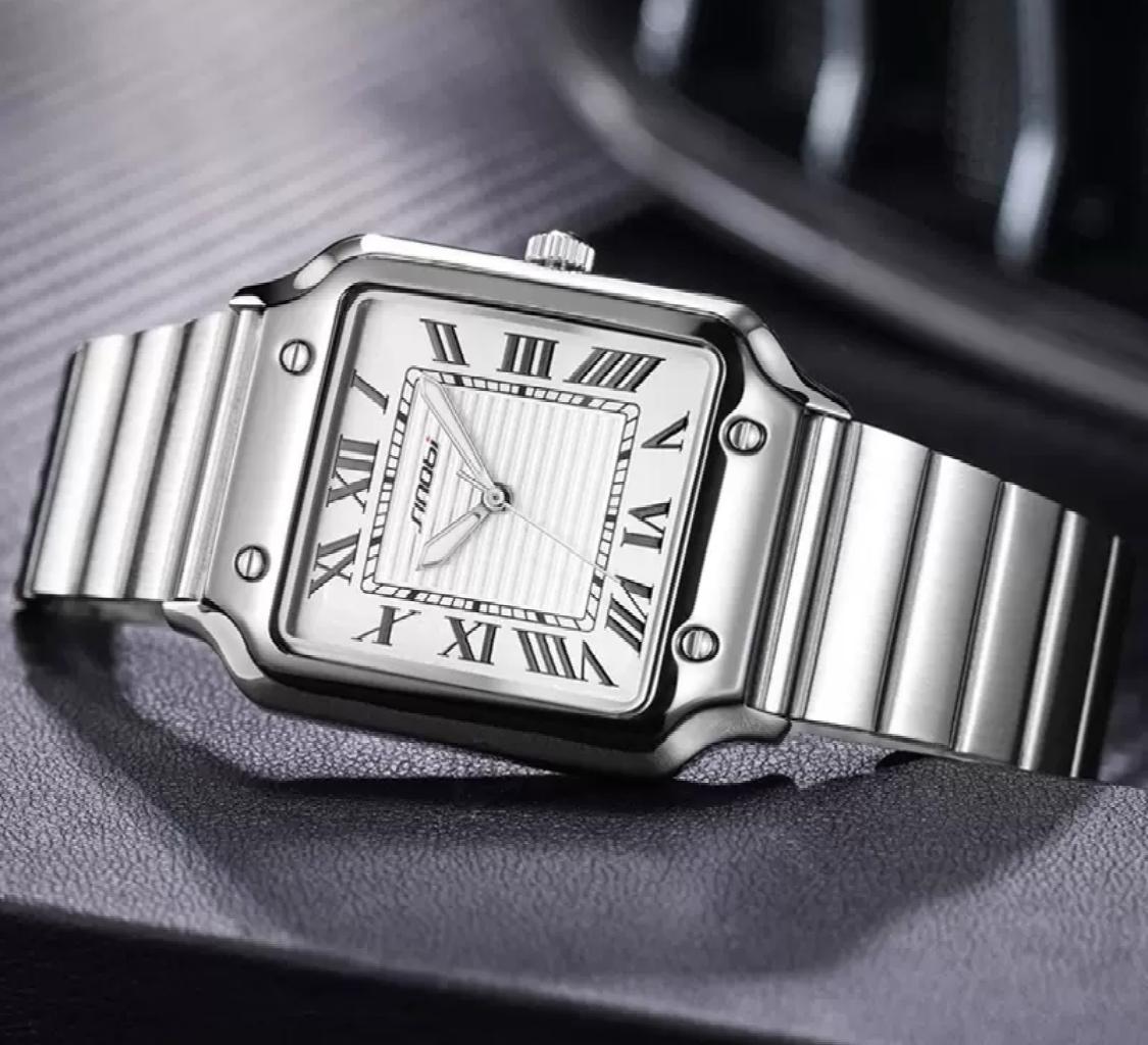 Entdecken Sie zeitlose Eleganz in ihrer reinsten Form – mit der Silberglanz Époque, einer Armbanduhr, die klassische Raffinesse mit moderner Präzision vereint. Das rechteckige Gehäuse mit polierter Edelstahloberfläche und markanten Schraubdetails erinnert an ikonisches Uhrendesign der Haute Horlogerie.