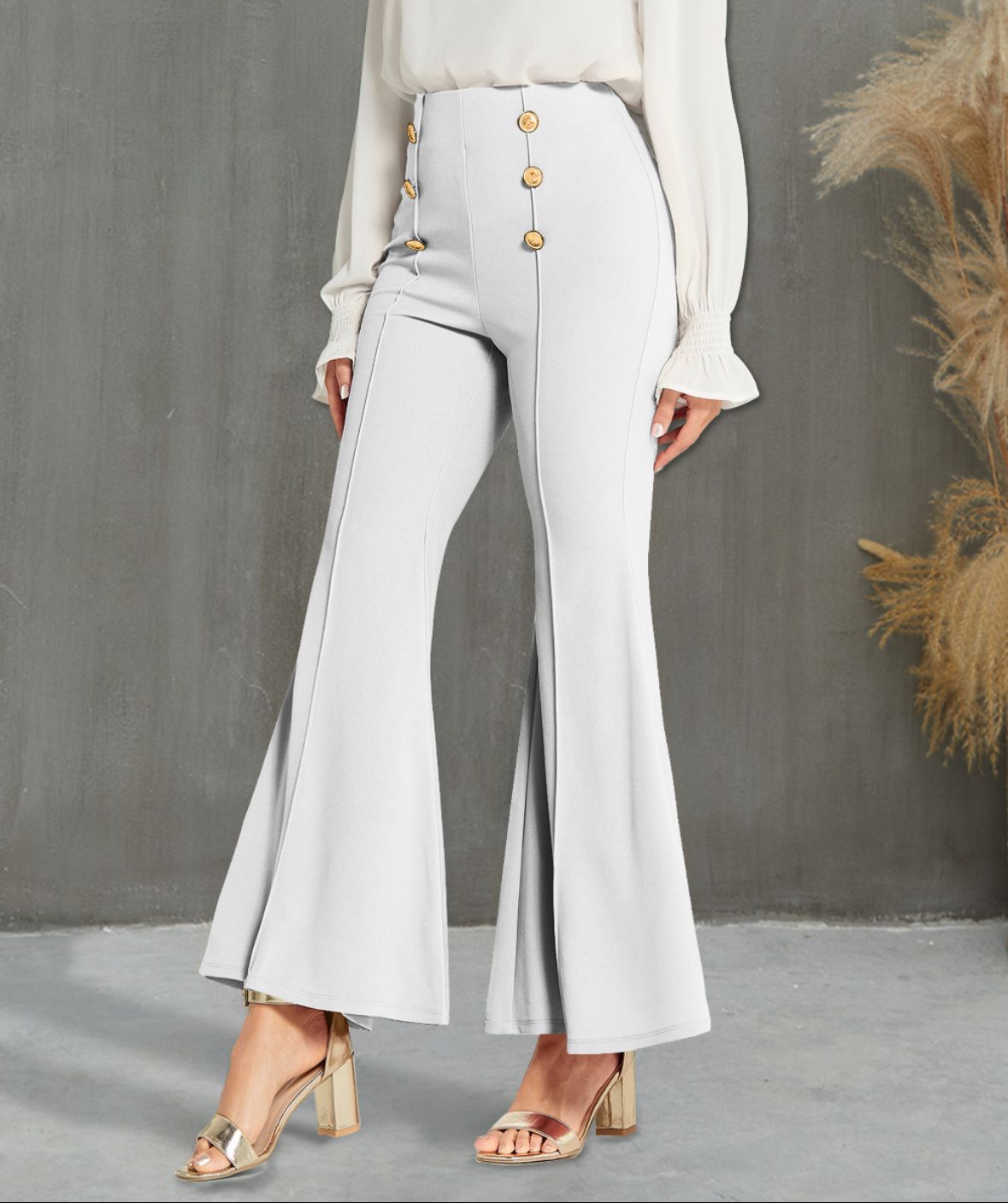 Verleihe deinem Look einen Hauch von Retro-Glamour mit unserer Elegance High-Waist Flared Pants – “Celina”. Diese stilvolle Hose in elegantem Hellgrau überzeugt mit ihrer hoch taillierten Passform, die deine Silhouette perfekt in Szene setzt. Die auffällige Knopfleiste mit goldfarbenen Zierknöpfen auf beiden Seiten verleiht dem Design einen maritimen Touch, während das ausgestellte Bein für einen eleganten Schwung sorgt.