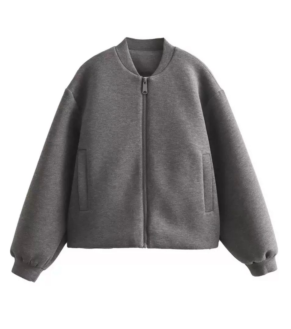 Das weiche, strukturierte Material sorgt für ein angenehmes Tragegefühl, während der cleane Reißverschluss und die leicht gepufften Ärmel ein Statement setzen. Kombiniert mit Jeans, High-Waist-Pants oder einem lässigen Kleid wird sie schnell zu deinem Lieblingsstück.