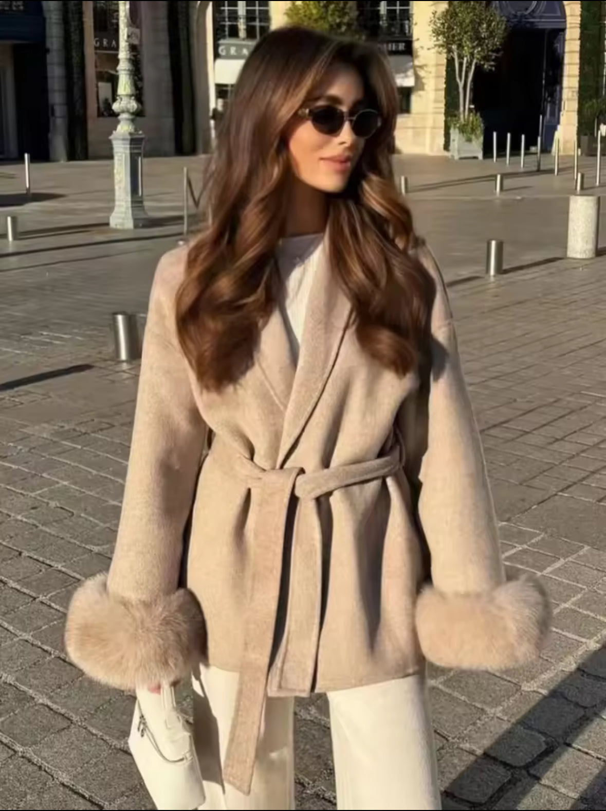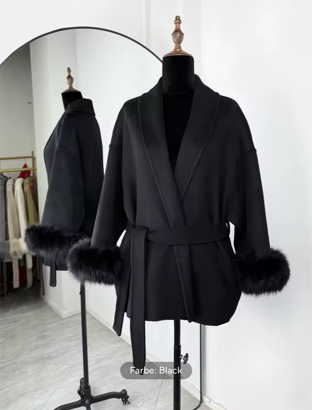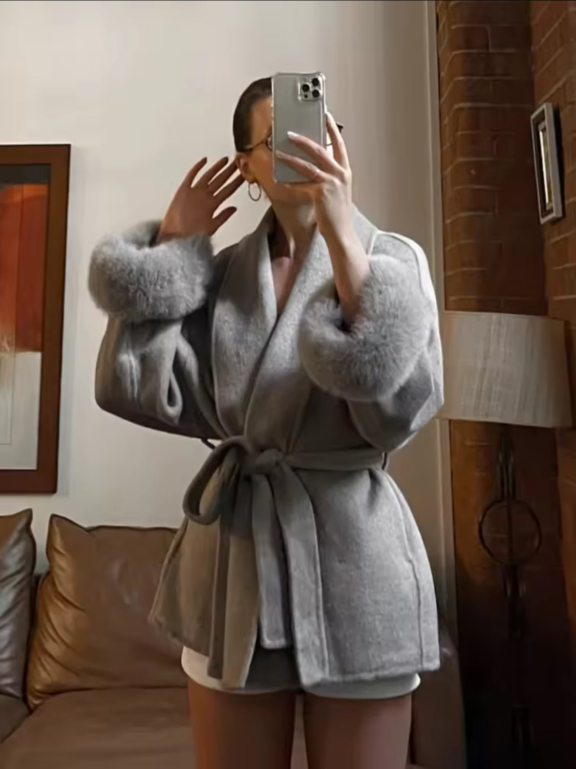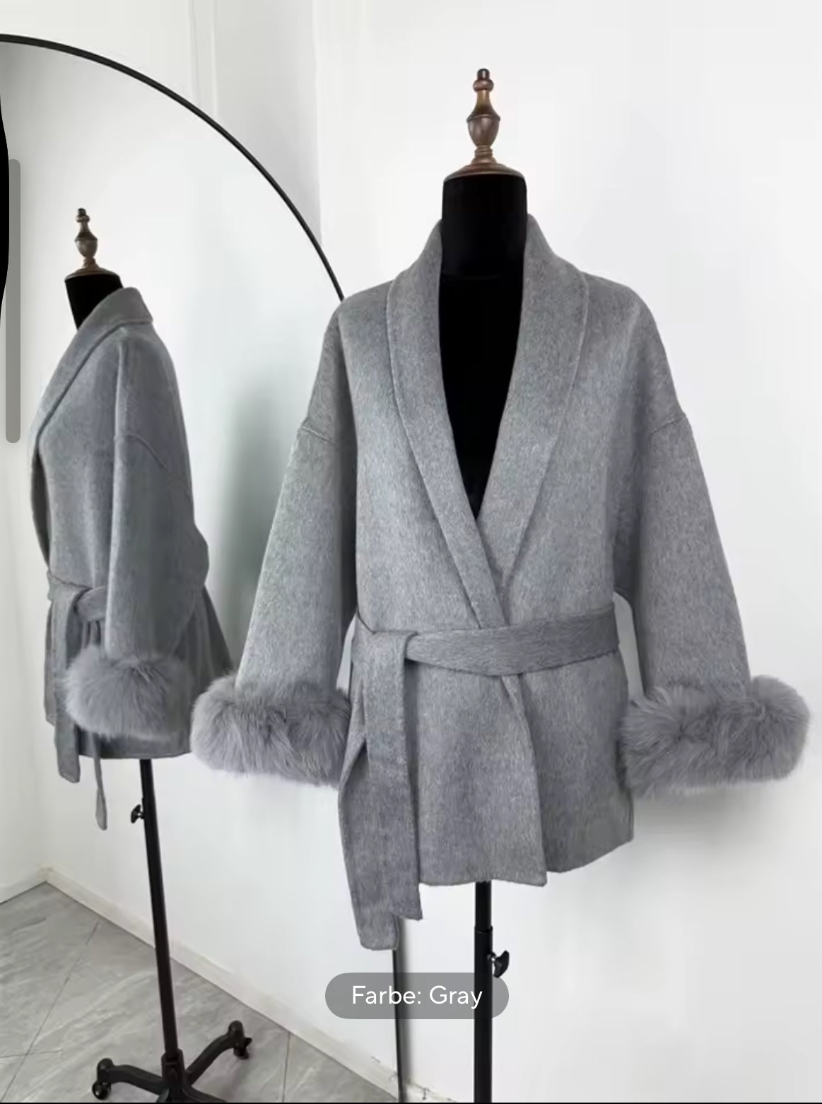 Luxuriöser Wollmantel mit Fuchspelz – Elegant & Zeitlos in Grau